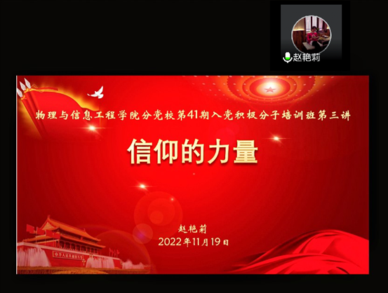 邀请校党委组织部赵艳莉老师做《信仰的力量》专题讲座。学院党委组织员王明老师主持,学院分党校第41期入党积极分子培训班252名学员线上参加。