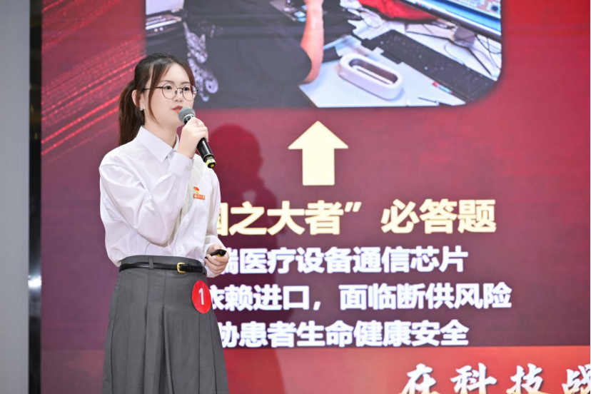 吴昀晶同学以《创新微光全球担当——医疗器械创新中的红色引擎》为题,以自己所在支部研发的关键芯片为切入点,深情讲述了团队从突破“卡脖子”技术到展现中国“大担当”,从涌动“创新潮”到服务“振兴路”,从深耕“实验室”到助力“一带一路”的奋斗事迹,充分展现了科技报国情怀,激励全体党员师生牢记宗旨,用科技创新为中国式现代化注入强劲动能。