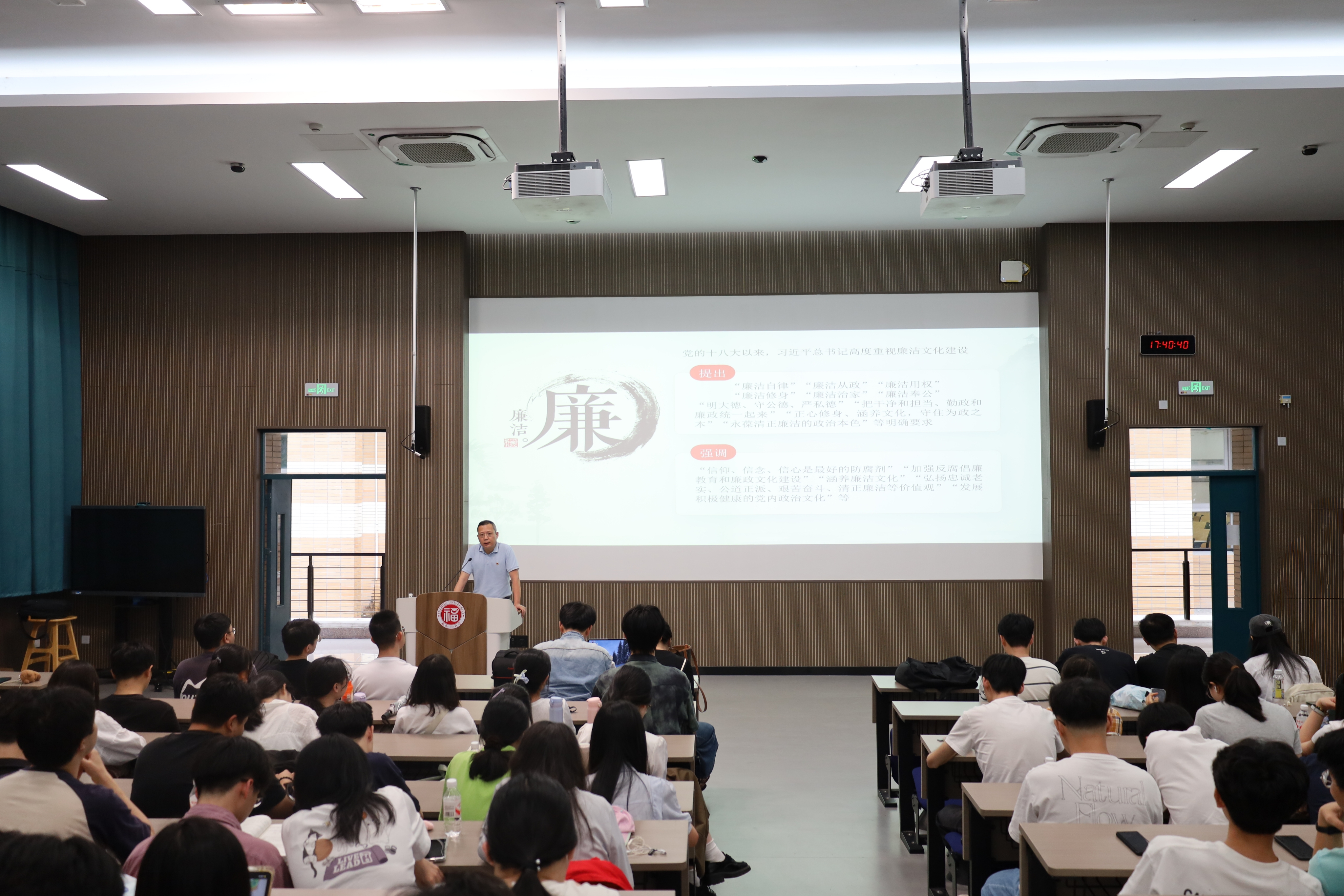 在专题党课环节,党委副书记郑志刚以《廉洁修身,保持共产党员本色》为题,通过理论溯源、案例剖析、实践指引三维度展开教学。他系统阐释了新时代廉洁文化内涵,结合中央八项规定精神学习教育的最新要求强调毕业生党员要永葆“赶考”清醒,在政治立场上始终与党中央保持高度一致,在思想淬炼中筑牢拒腐防变防线,在实践中践行“请党放心”的青春誓言。最后他希望毕业生党员们能够以党章为镜检视言行,以纪律为尺丈量步伐,以使命为灯照亮前路,做政治有立场、思想有灵魂、言行有尺度和生活有道德的“四有青年”。