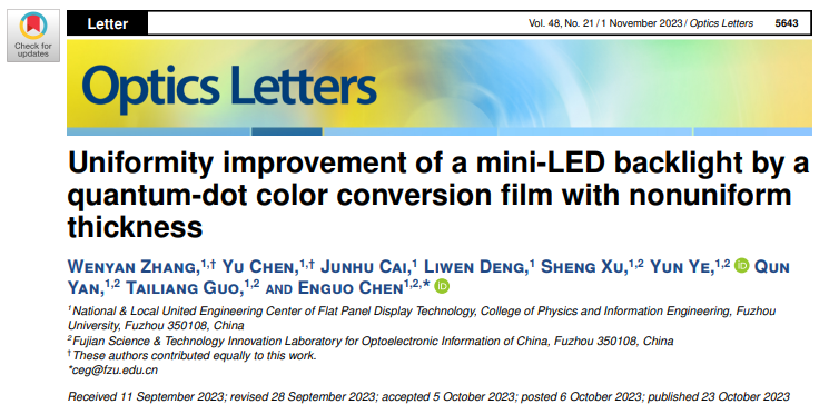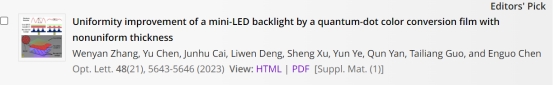 光电系郭太良和严群教授科研团队的陈恩果教授研究小组在mini-LED背光均匀性提升研究方面取得重要进展,该研究基于mini-LED阵列的发光特性首次提出一种可以提升直下式背光亮度均匀性的非均匀厚度量子点色转换膜。2023年10月23日,该项研究的最新成果以“Uniformity improvement of a mini-LED backlight by a quantum-dot color conversion film with nonuniform thickness”为题在美国光学学会权威期刊《Optics Letters》上发表,论文被选为该刊Editor’s Pick (编辑精选)文章,该刊每期只有约5%的论文能够入选(注:Editors’ Picks serve to highlight articles with excellent scientific quality and are representative of the work taking place in a specific field),硕士研究生张文艳和博士研究生陈瑜为论文的共同一作,杏吧传媒