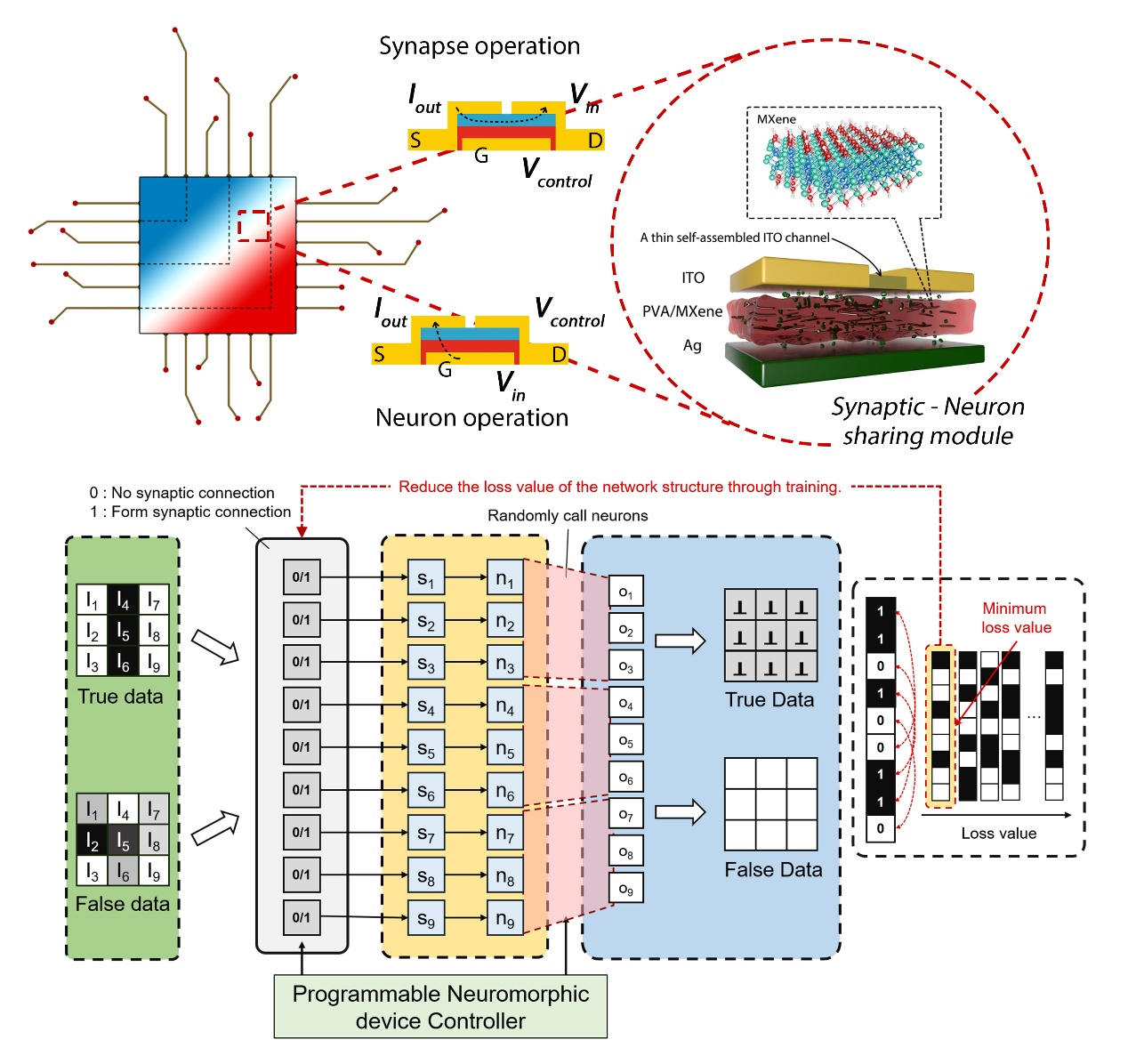 该工作提出了一种多神经形态功能器件——可切换神经元突触晶体管 (SNST),它在具有相同晶体管结构和制造工艺的同一器件上同时集成突触和神经元功能,从突触功能到神经元功能的转换通过编程改变电路中SNST的连接方式来实现,打破了神经元模块和突触模块之间的物理界限。此外,文章设计了由多个SNST组成的神经形态网络,用于真伪数据识别,并通过编程控制突触和神经元的切换,可以按需重新分配突触资源和神经元资源,从而减少网络中的设备数量,提高资源利用率(接近100%)。由于能够同时训练权重和结构,给予SNST的硬件神经网络的训练速度比传统的神经形态设备提高了约 200%。该工作为实现高精度、高效率(制造效率、资源利用效率和运行效率)的自上而下的可编程神经形态芯片打下重要基础,这对于神经形态硬件系统以及神经形态显示系统的开发具有重要意义。
