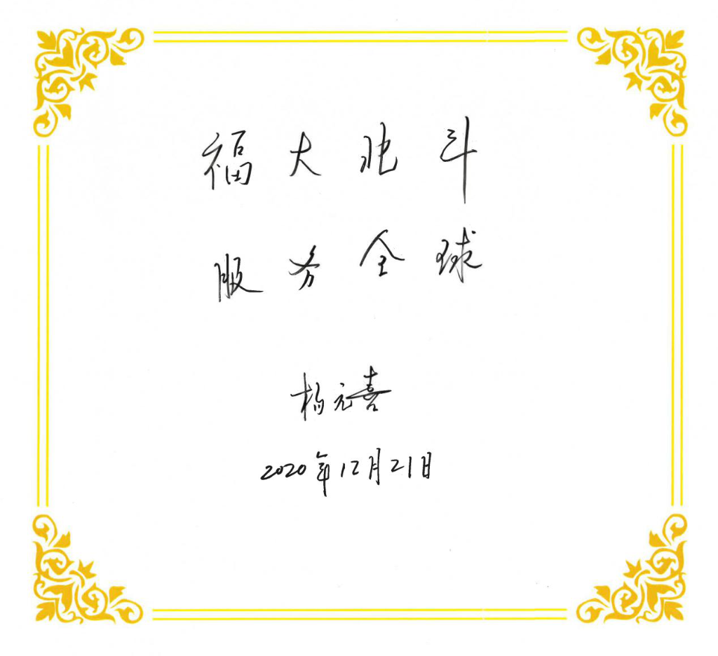 最后,杨元喜院士欣然为福大北斗题字“福大北斗 服务全球”,对福大北斗团队的未来发展寄予了厚望。