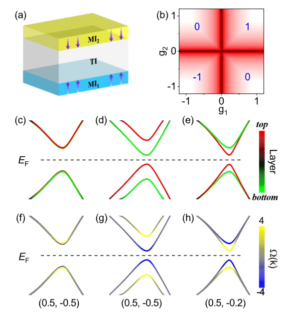(a)磁性/拓扑绝缘体异质结示意图;(b)参数空间的陈数相图;(c)-(h)层分辨/贝利曲率分辨的能带结构,三列分别表示轴子绝缘体态、电场诱导的以及不等价交换场诱导的层霍尔效应。