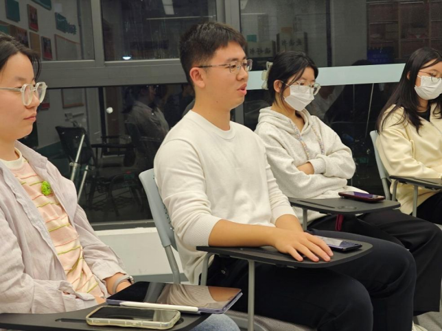 在理论学习环节,全体师生一起观看了“习近平总书记在福建考察时的重要讲话”视频节选和“习近平总书记回信勉励中国国际大学生创新大赛参赛学生代表”视频节选。在交流环节,对于“投身科技创新,贡献青春力量”这一议题,与会师生分别发表了自己的看法与见解。2024年中国国际大学生创新大赛金奖项目成员代表林宏锦表示,参加中国国际大学生创新大赛不仅仅提升了自己的科研能力,还锻炼了自己的团队协作和沟通能力,更使我意识到只有将自身研究与国家战略相结合,才能以青春之我为科技创新注入不竭动力。