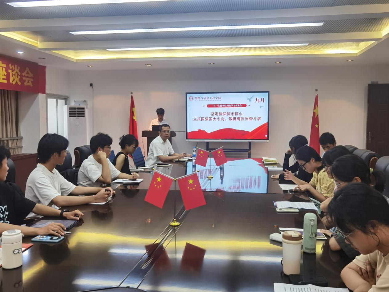 于铜盘校区教学楼A栋会议室开展“一月一‘习’话”——师生理论学习交流会。此次九月份的理论学习主题为:坚定信仰信念信心,立报国强国大志向、做挺膺担当奋斗者。杏吧传媒