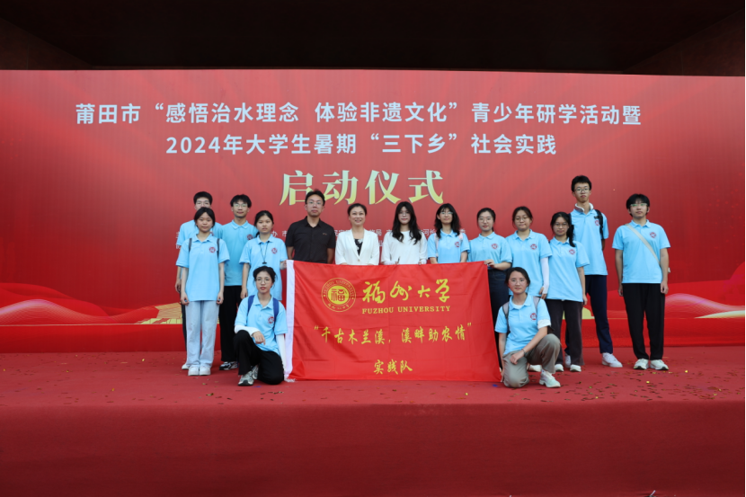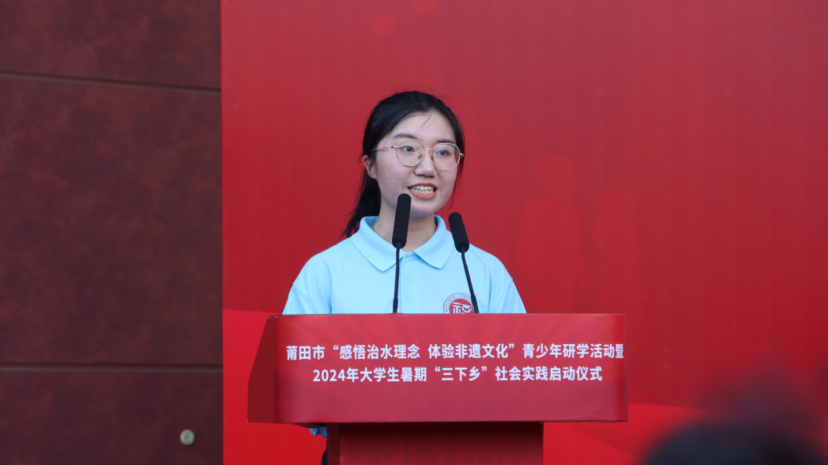 团委刘玮书记共同参与莆田市“感悟治水理念 体验非遗文化”主题研学实践活动暨大学生暑期“三下乡”社会实践启动仪式。实践队成员程湘儿作为福建省内高校学生代表上台发言。程湘儿同学代表实践队分享了此次活动的所闻所感,体现出此次社会实践活动对青年大学生的教育意义,展现出当代青年在探访社会后斗志昂扬、奋发向上的精神风貌。