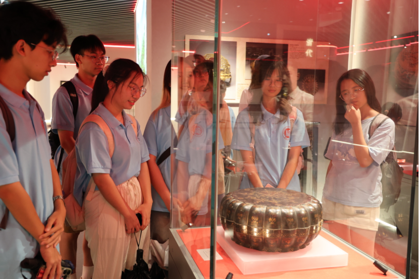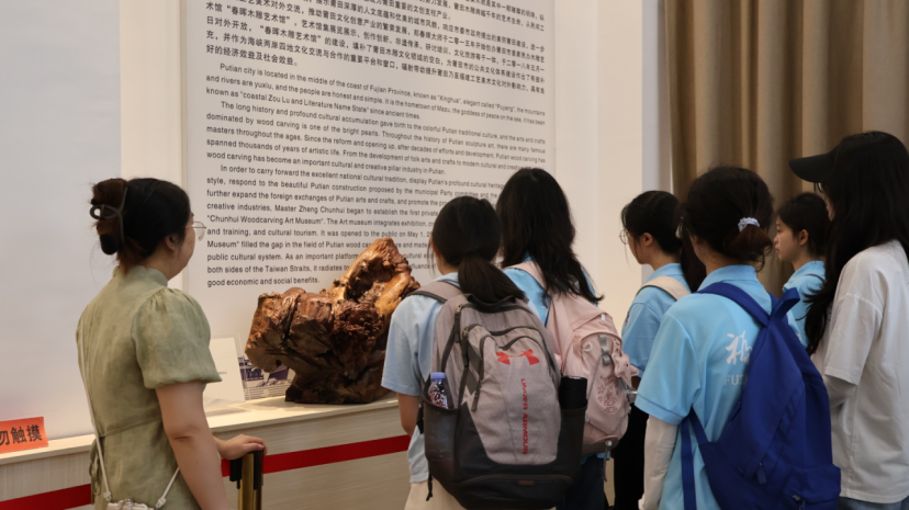 (队员们在讲解员的带领下参观春辉木雕艺术馆)