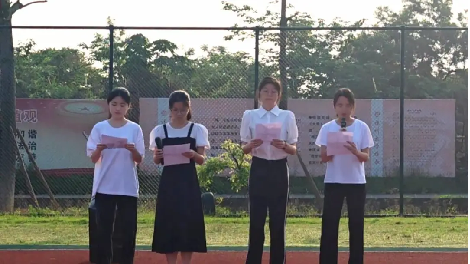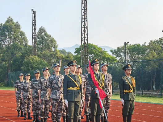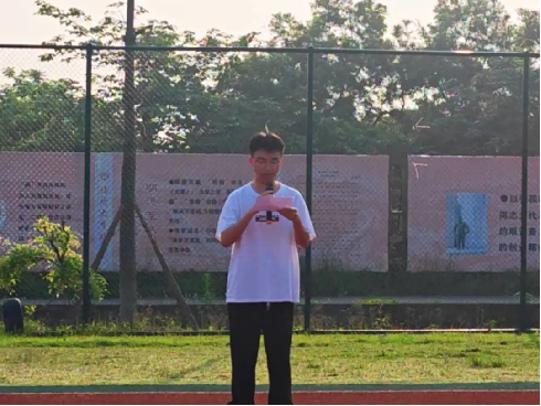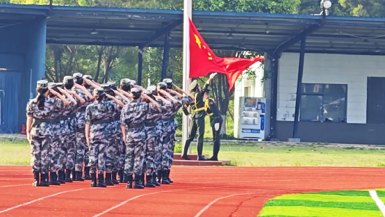 阳光洒落在操场,金色的光芒映照在跑道上。在这庄严和又神圣的时刻,国旗护卫队迈着整齐有力的步伐向着国旗台前进。