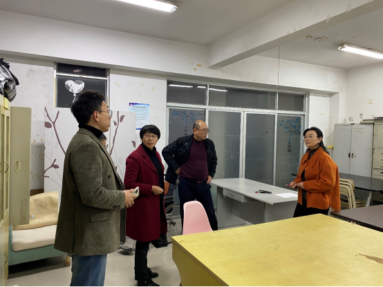 刘敏榕馆长一行首先实地走访了15号楼一楼活动室,并向学院社区建设负责人刘涛和15号楼楼宇党支部书记伦婉潼详细了解了楼宇学生党员开展活动情况、现有空间使用情况。调研结束后,刘敏榕馆长当即表示将充分利用图书馆的资源,通过为学生送图书、送书架等做法改善活动室的学习环境。同时,为进一步打造党建引领阵地,刘敏榕馆长现场调派了2位设计、施工人员进行探讨,依照提升活动室内涵建设的思路,提出了党建墙、党员风采墙、学习园地等设计方案,要求施工人员10日内完成党建活动室施工,扎实推进“一站式”学生社区建设,增强学生获得感、幸福感,助力学生健康成长成才。