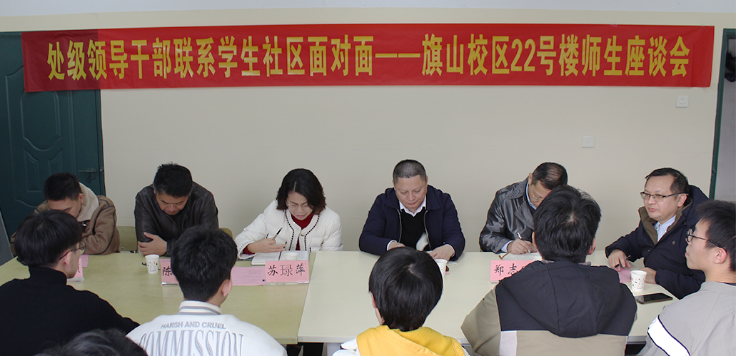 为将学生社区打造成党建前沿阵地、“三全育人”实践园地、智慧服务创新基地、平安校园样板高地,推动领导干部常态化深入学生社区“面对面”关心学生,增强学生社区思想政治工作的渗透力、亲和力与实效性,2023年12月27日下午,处级领导干部联系学生社区面对面——暨旗山校区22号楼师生座谈会在旗山校区22号楼2楼学生活动室举行。