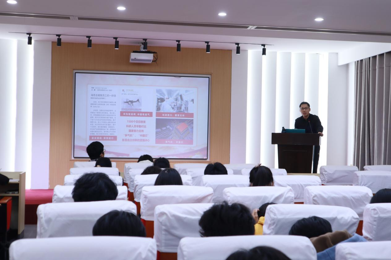 在主题团课上,陈山老师以近期热点话题搭载华为自主研发芯片的Mate 60手机为例引出本次团课主题,他强调,理想是科技创新的旗帜、信仰是强国复兴的基石。他指出,华为手机从摇摇欲坠摇身一变为遥遥领先,主要依靠的就是坚持“以客户为中心,以奋斗者为本”的信仰,不断在艰苦奋斗突破了芯片瓶颈的限制,证明了不依赖于国外技术和部件,中国人也可以造出高端手机。芯片的突破性发展对中国具有深远的意义,解决“卡脖子”和“命门”问题,关键靠自主创新。我国的科技实力正是因为一代又一代科研人在不懈努力中得到了前所未有的提升。
