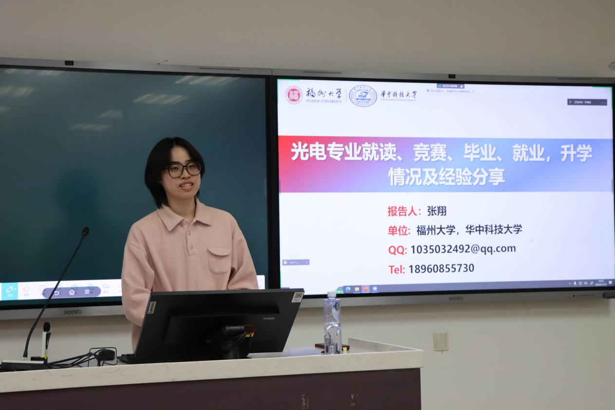邀请2023届优秀毕业生、光电信息科学与工程的张翔同学做题为《我的求学路——光电专业就读、竞赛、毕业、就业,升学情况及经验分享》的报告。出席本次活动的有光电系老师陈恩果和全体光电系学生。