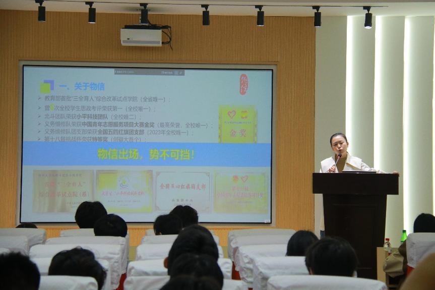 首先,苏海姬老师回顾了学院近五年来的学生工作成果:学院入选首批教育部“三全育人”综合改革试点学院;学院曾5次荣获学生工作思政考评第一名;物信学子在科创、文艺、体育竞赛中荣获优异成绩,充分展现学院“物信出场,势不可挡”的气势。