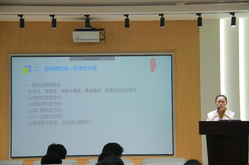 随后,苏海姬老师从为什么要担任学生干部和如何当好一名学生干部进行了讲解。她认为学生干部是学生群体中的少数关键,作为一名学生干部,不仅要做好自主管理的组织员、服务同学的勤务员,还要成为上传下达的联络员、安全稳定的情报员、全面发展的示范员。她表示,作为一名优秀的学生干部,在工作中一要以身作则、严于律己,起到模范带头作用;二要主动学习、挺膺担当,提高自身素质;三要积极思考、乐于奉献,发挥青春力量。