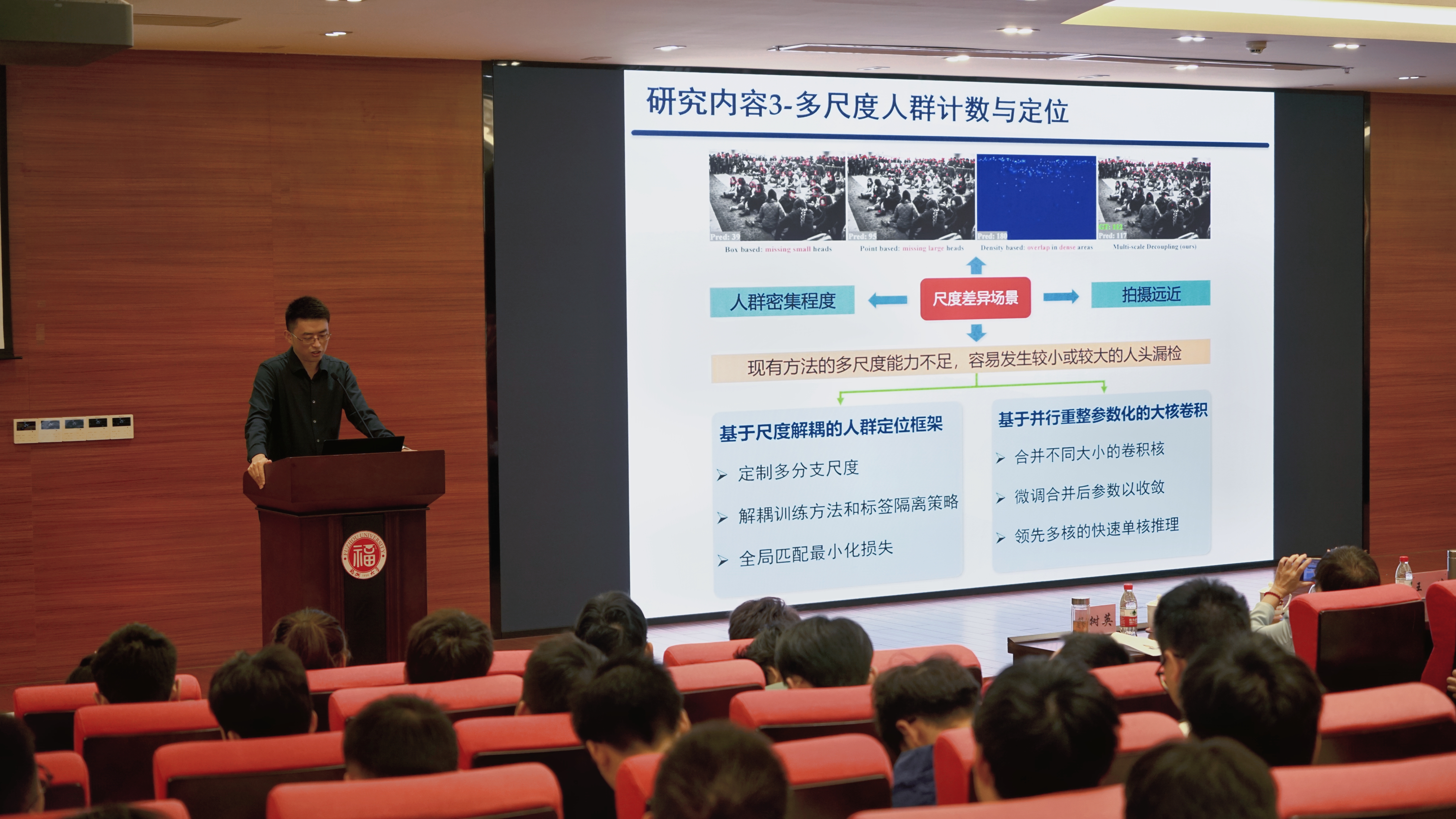西北工业大学的王琦教授带来的题为《面向真实场景的人群计数研究及其应用》的报告。他认为人群计数统计在公共空间设计、交通管制、现代城市规划、人流预警等方面具有重要意义。为解决数据与评测基准缺少的问题,团队重点进行了大规模样本采集、大尺度数据标注、算法测试平台开发工作。针对模型迁移能力差的问题,团队将域间隔离模型、跨域数据翻译、高斯先验重建等作为解决方案。应对场景尺度跨度大的问题,团队进行了尺度痛点问题分析,应用了尺度解耦框架、大核卷积模型等。报告的最后,他对人群计数未来的应用场景进行了展望。