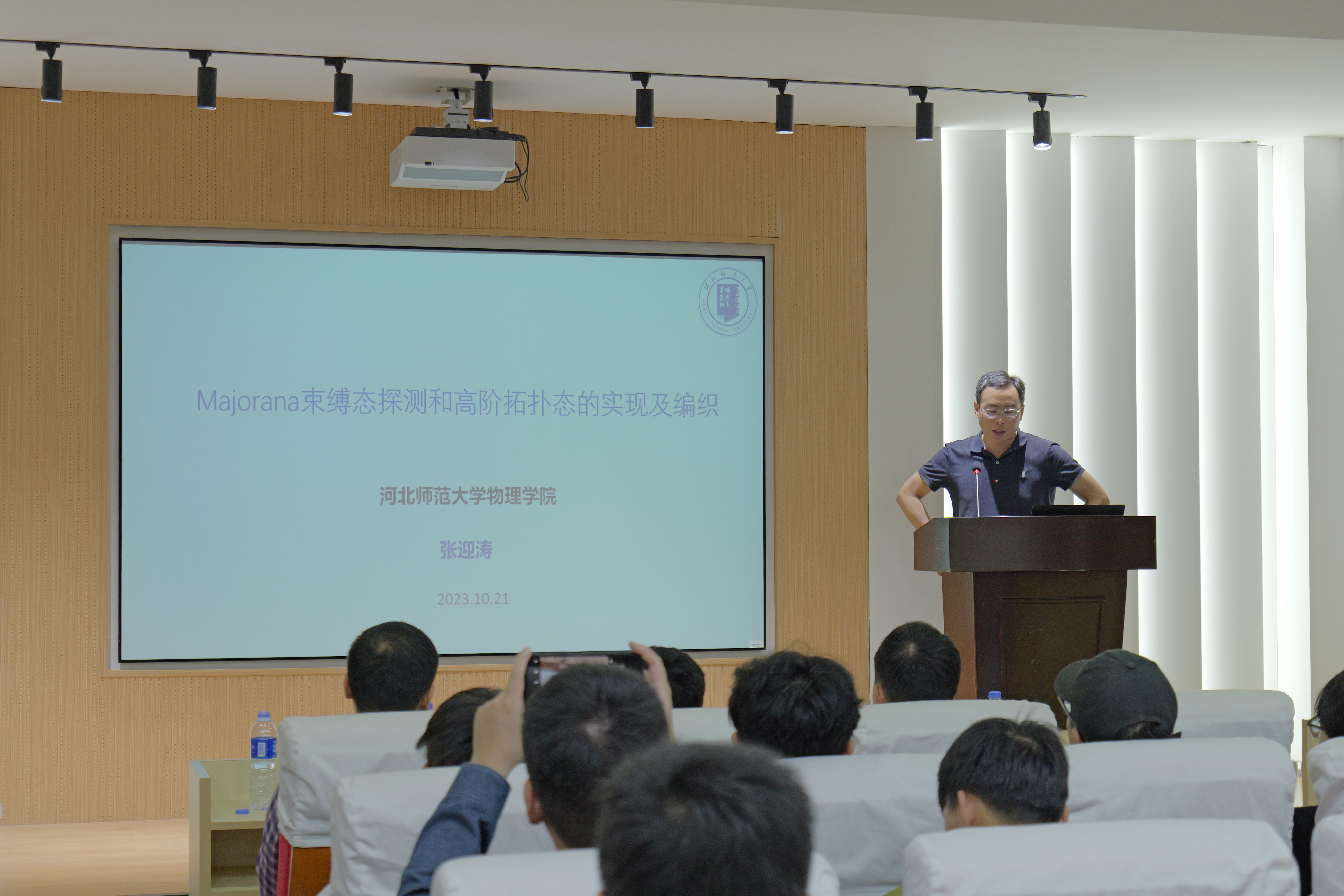 河北师范大学物理学院教授张迎涛的报告内容为《Majorana束缚态探测和高阶拓扑态的实现及编织》。张教授在报告伊始首先对Majorana费米子的提出,拓扑超导体等基础性概念进行了讲解,并对相关实验信号进行了说明。其次,张老师说明了如何在乔振华教授团队的研究基础上,通过不同边界的磁调控,实现Majorana角态绝热编织进程,为同学们提供了新思路。