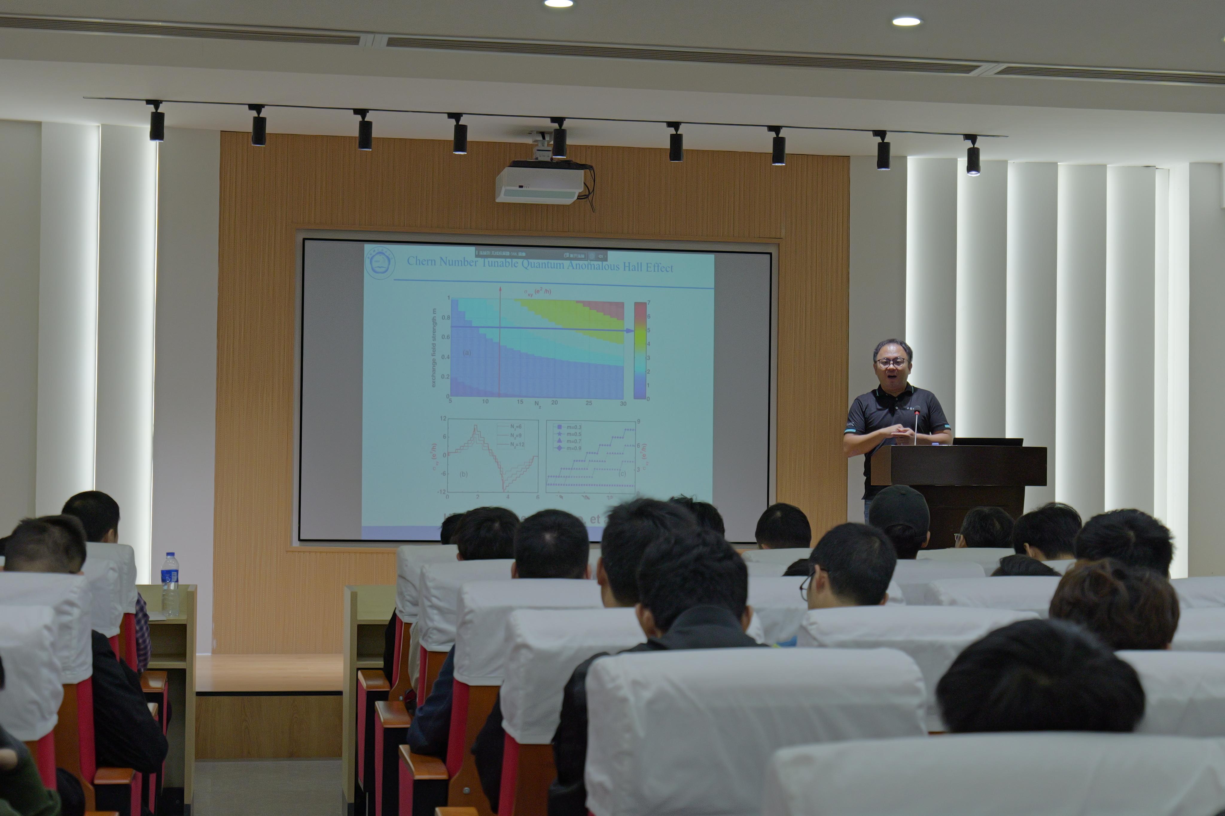中国科学技术大学乔振华教授的报告题目为《范德华层状材料体系中的拓扑物态的研究进展》。首先乔教授向同学们介绍了什么是霍尔效应,对现实中如何实现零耗散,低耗散的电子元器件提出了自己的猜想和假设,并介绍了以往科学家对量子反常霍尔效应的思考和研究。其次,乔教授围绕石墨烯体系,介绍其团队在范德华层状体系中的各种拓扑相方面的研究进展,包括石墨烯磁化、掺杂不同原子、使用不同磁性衬底等一些有关石墨烯中实现量子反常霍尔效应的研究和结果。