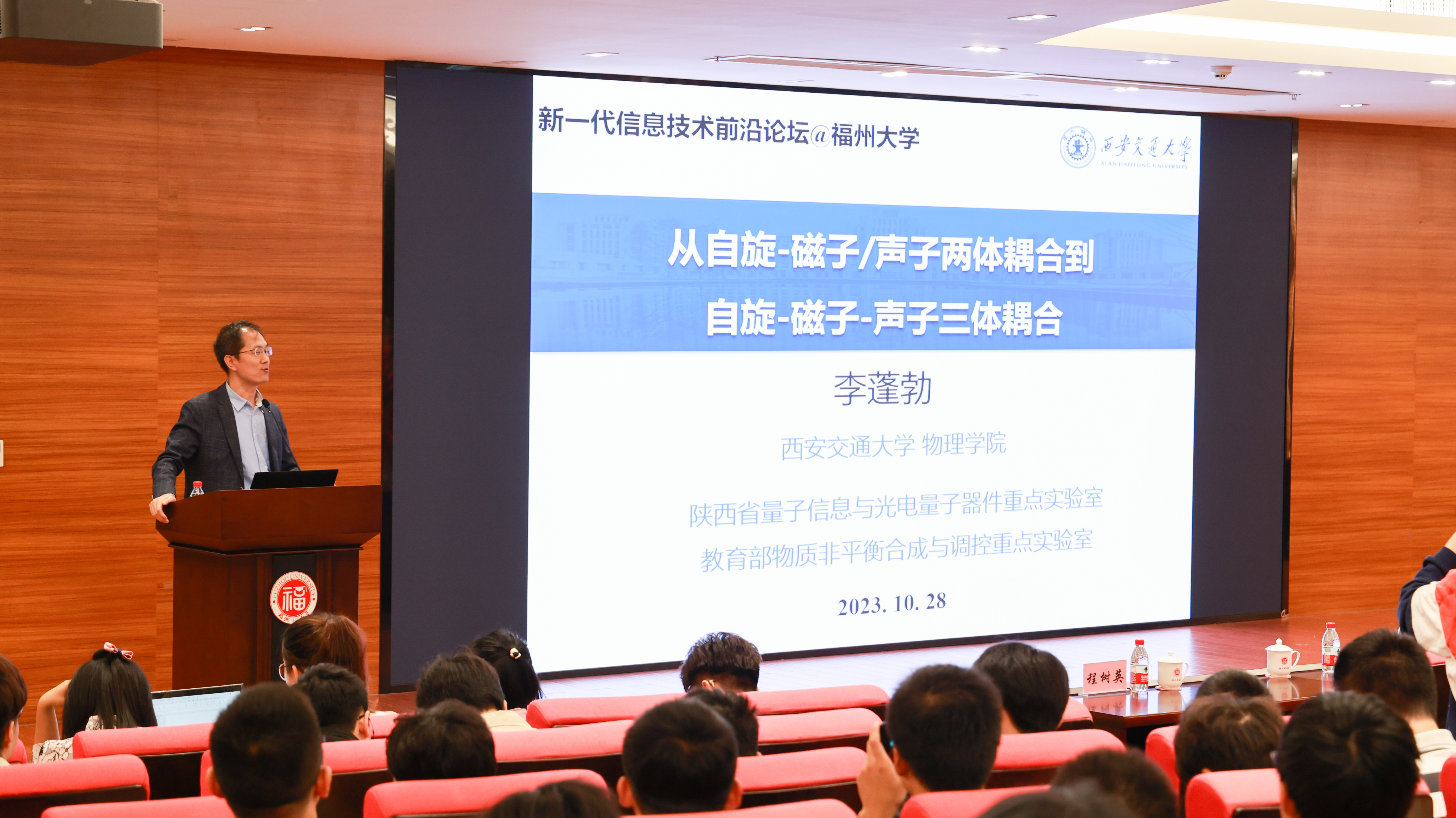 国家级青年人才、陕西省杰青,来自西安交通大学物理学院教授李蓬勃的报告题目为《从自旋-磁子/声子两体耦合到自旋-磁子-声子三体耦合》。李教授首先简要介绍基于JC相互作用的混合量子系统的研究背景,然后介绍课题组在自旋-磁子-声子量子三体相互作用研究方面取得的最新进展。该研究为实现单量子水平自旋-磁子-声子三体强耦合奠定了理论基础,有望在基于固态电子自旋的多自由度量子器件以及量子信息领域中获得重要应用。
