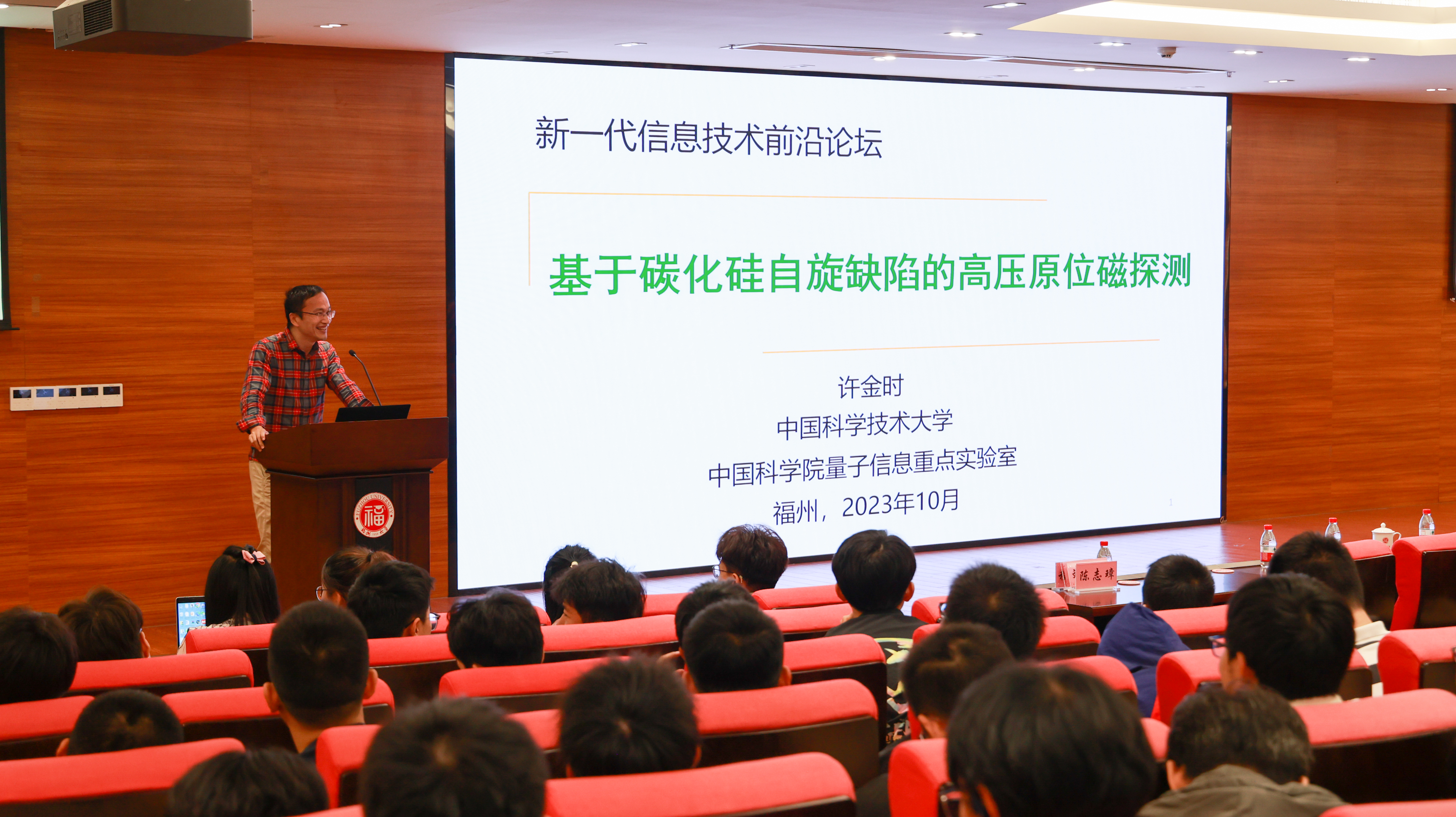 中国科学技术大学讲席教授许金时作了题目《基于碳化硅自旋缺陷的高压原位磁探测》的报告。针对原位高分辨的磁测量的难题,他所在的团队研究了高压下碳化硅中硅空位缺陷和双空位缺陷的光学和自旋性质,实现高压环境下自旋量子态的相干调控。该工作发展了基于固态缺陷自旋的高压原位磁探测技术,为磁性材料和新型超导体高压性质的刻画提供了一个优异的量子研究平台。