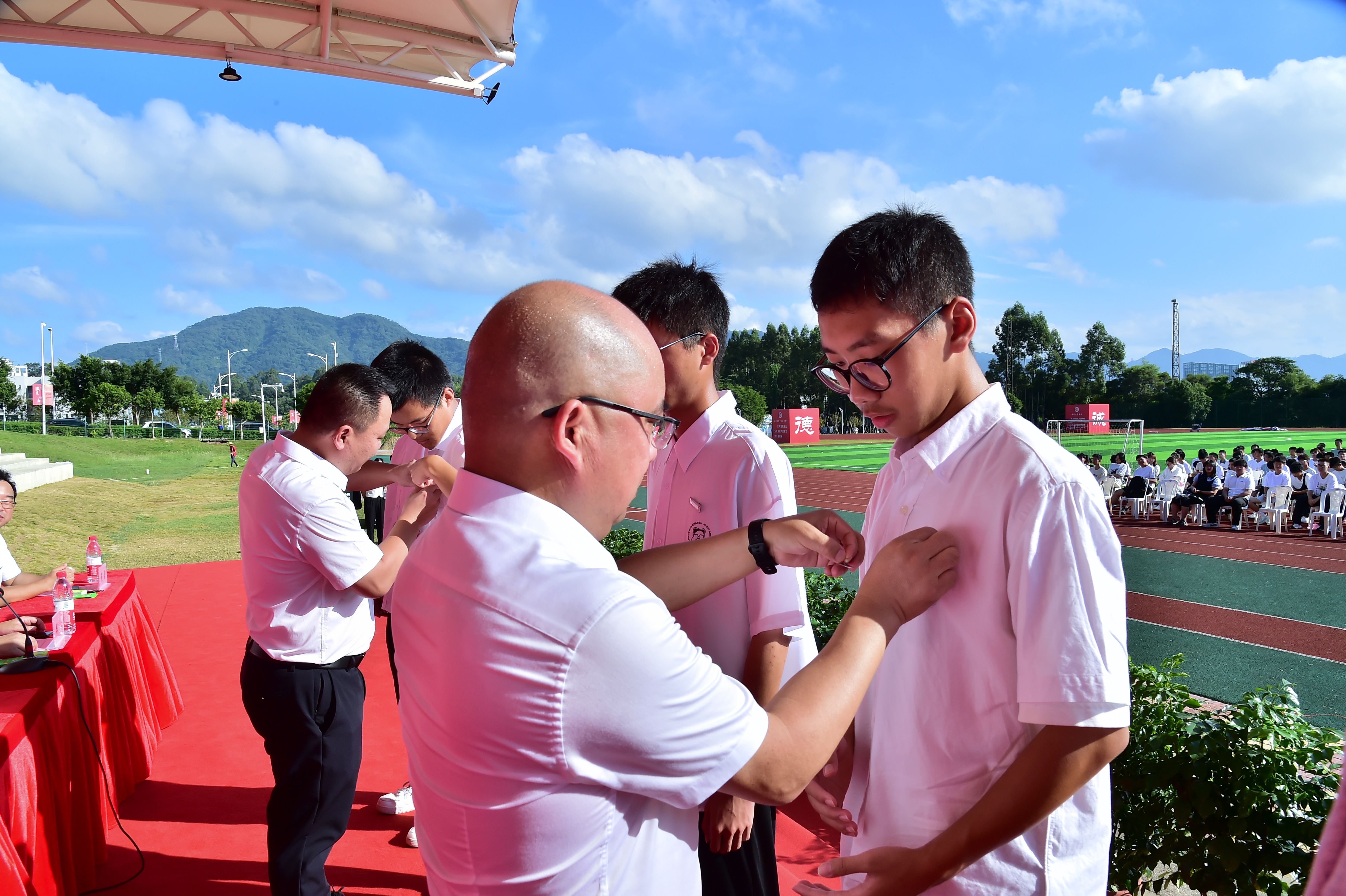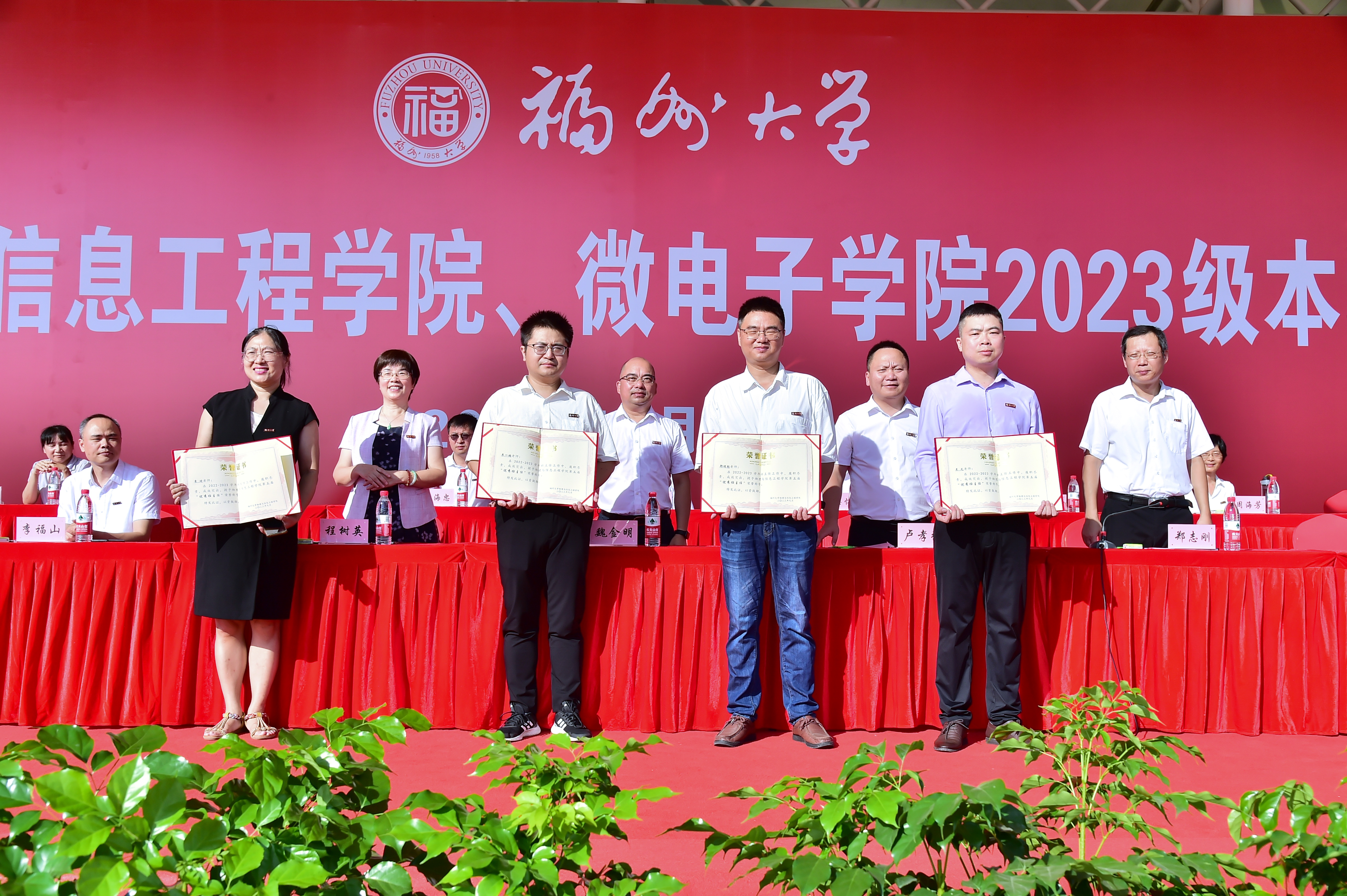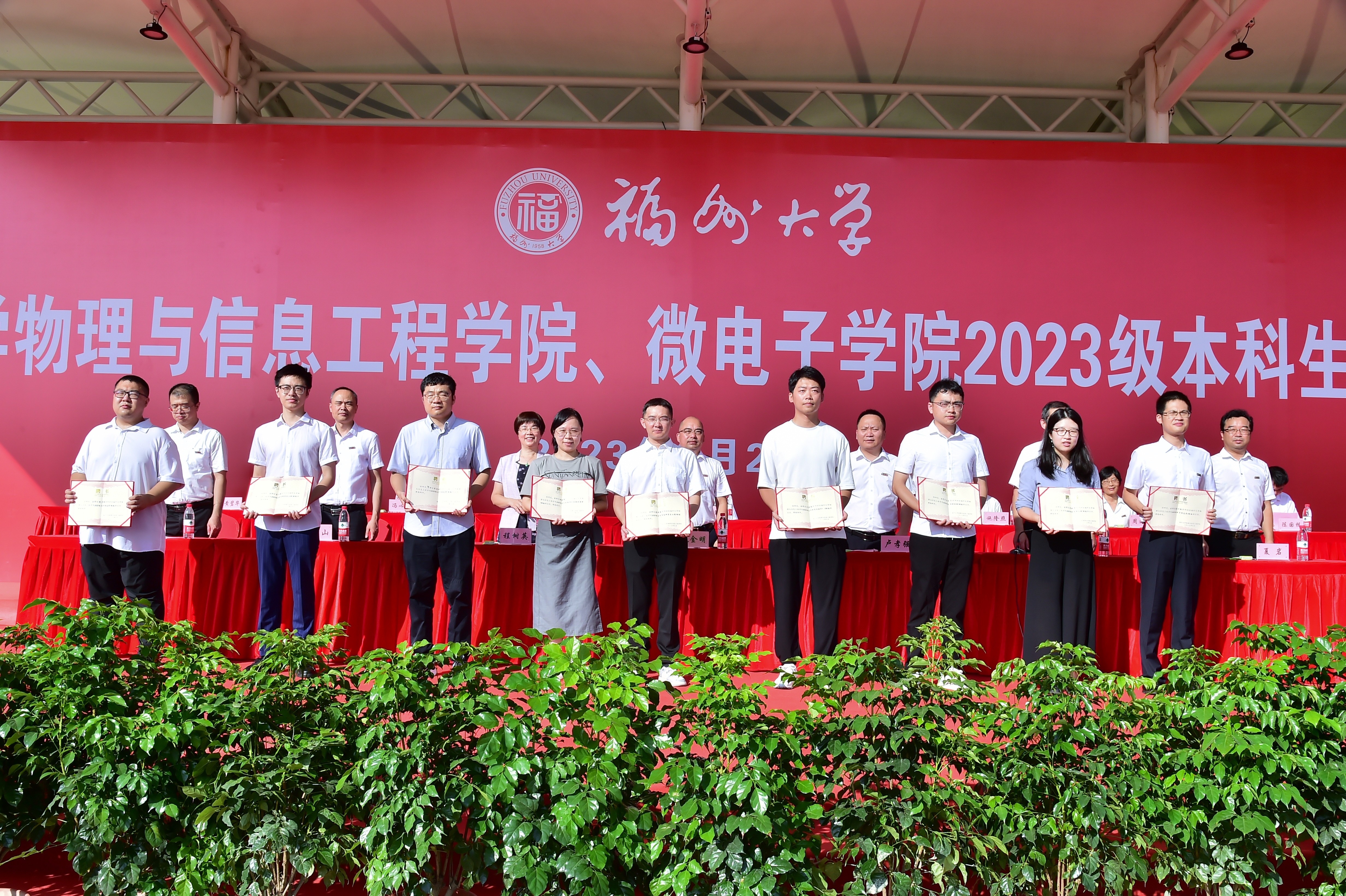 院党委书记魏金明教授、院长卢孝强研究员、微电子学院院长程树英教授为新生代表佩戴校徽,台下新生齐将校徽佩戴在胸前,带着自豪感和责任感,接过新时代青年奋斗的接力棒,正式成为一名“福大物信人”。