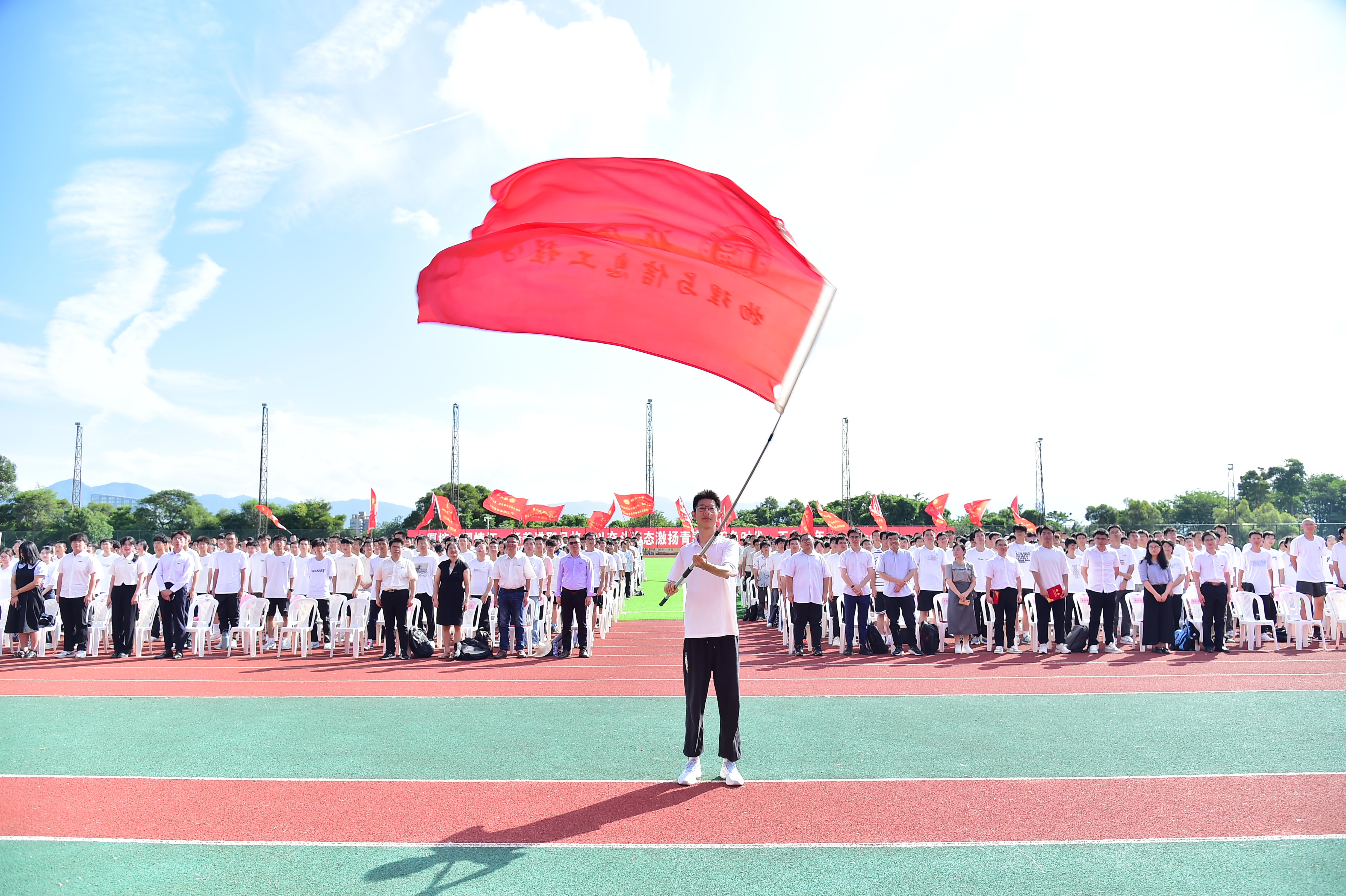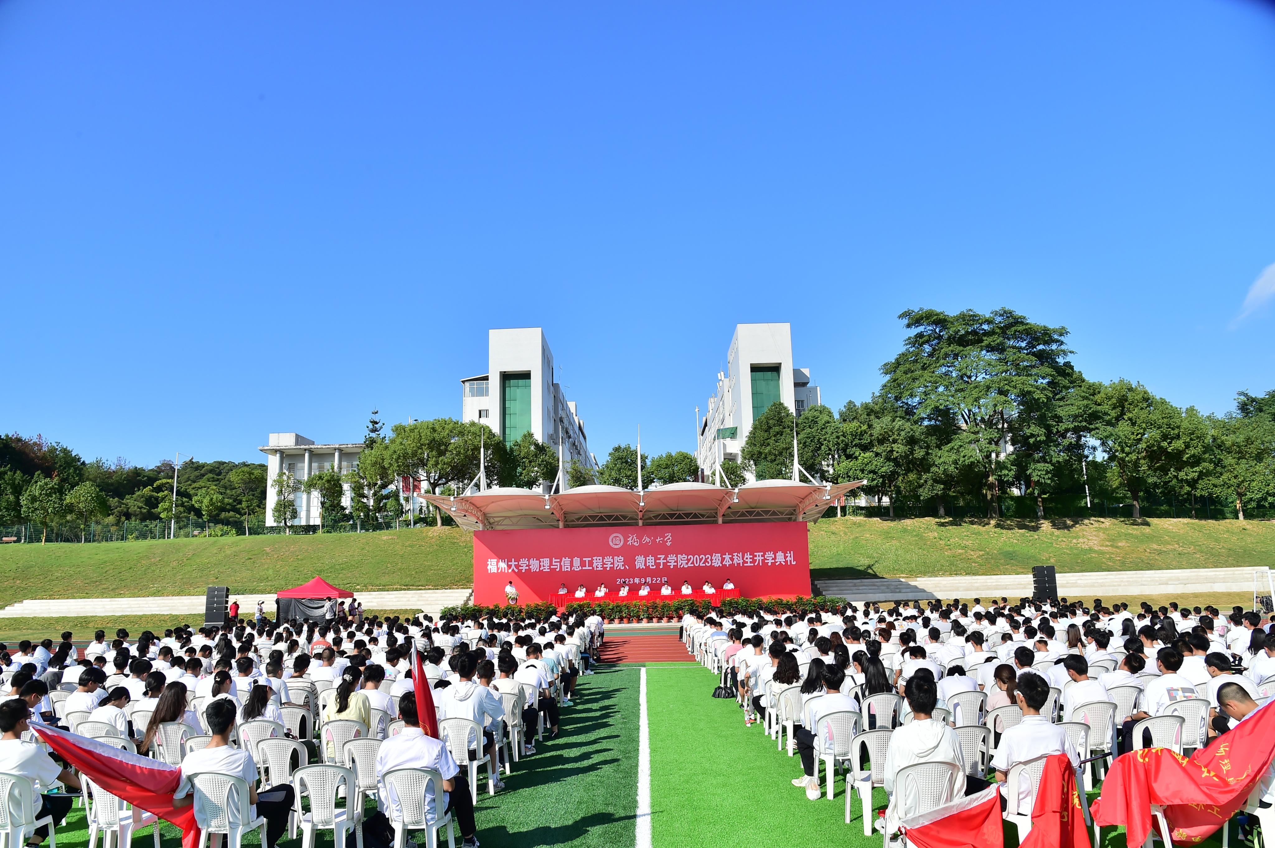 、微电子学院2023级本科生开学典礼于铜盘校区田径场隆重举行。院党委书记魏金明教授、院长卢孝强研究员、微电子学院院长程树英教授、院党委郑志刚副书记、副院长李福山研究员、副院长夏岩教授、微电子学院副院长魏榕山教授,院长助理黄立勤教授、吴怀志教授、张海忠教授,各系主任、支部书记、政工干部与2023级全体本科新生参与本次活动。本次典礼由院党委郑志刚副书记主持。