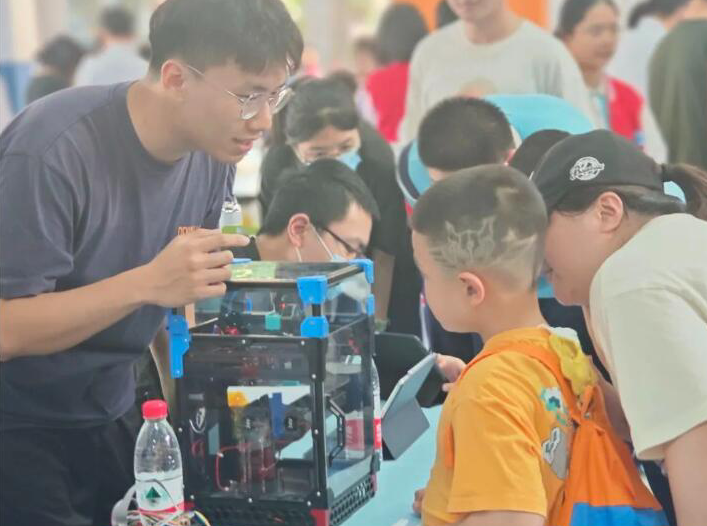 物信义务维修队及电子爱好者学社学子在高校学生社团展示区进行科技作品展示。