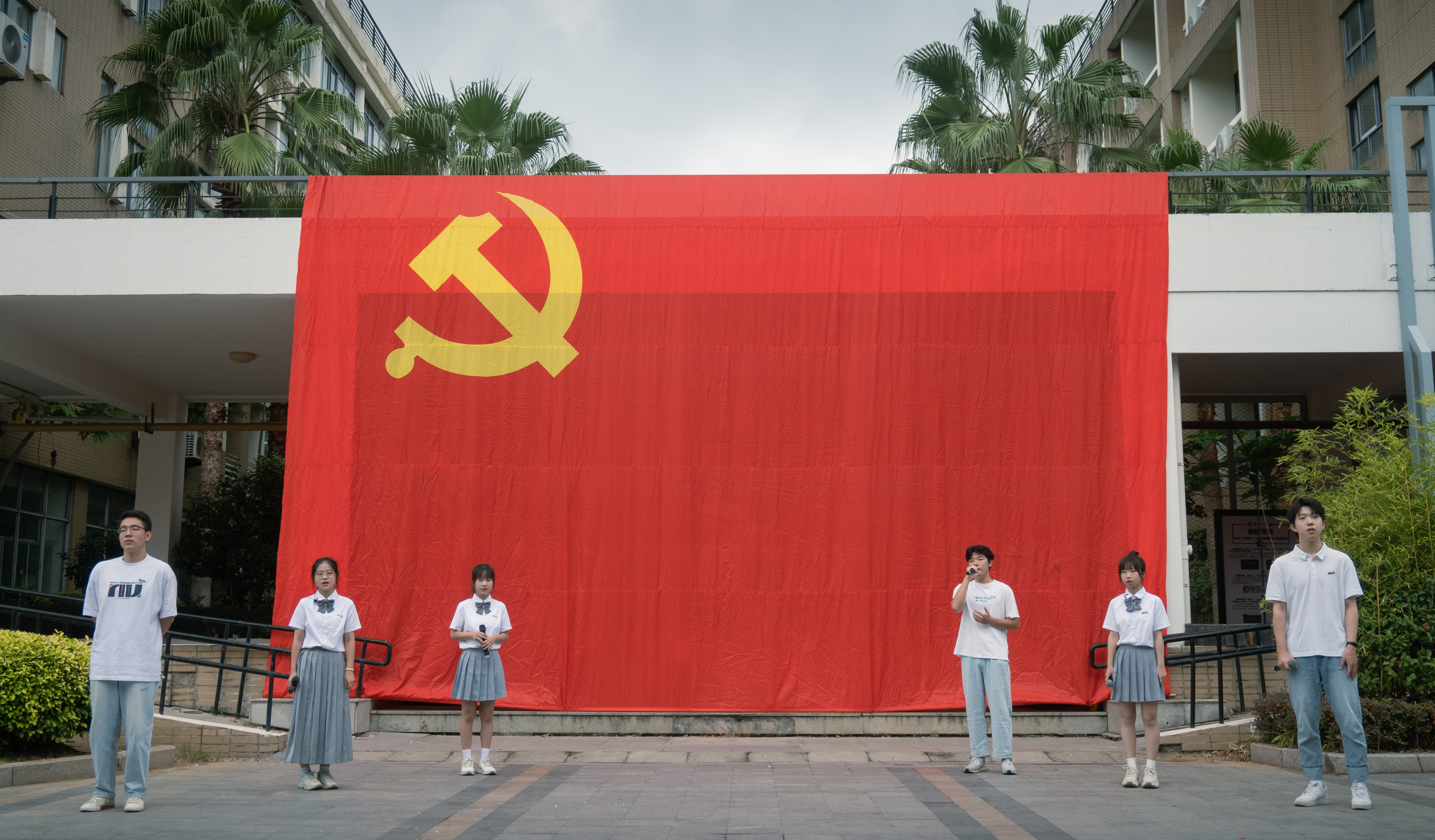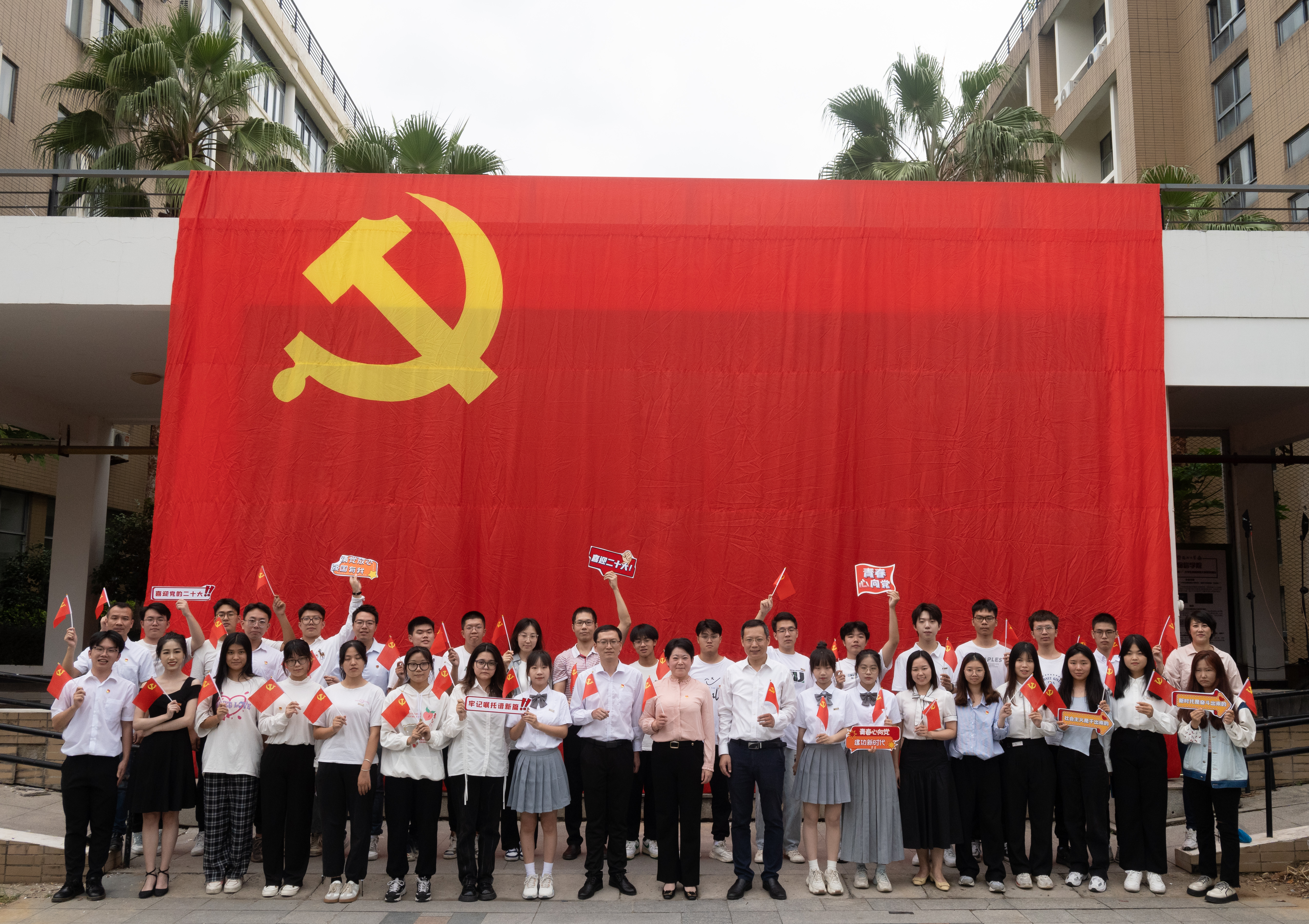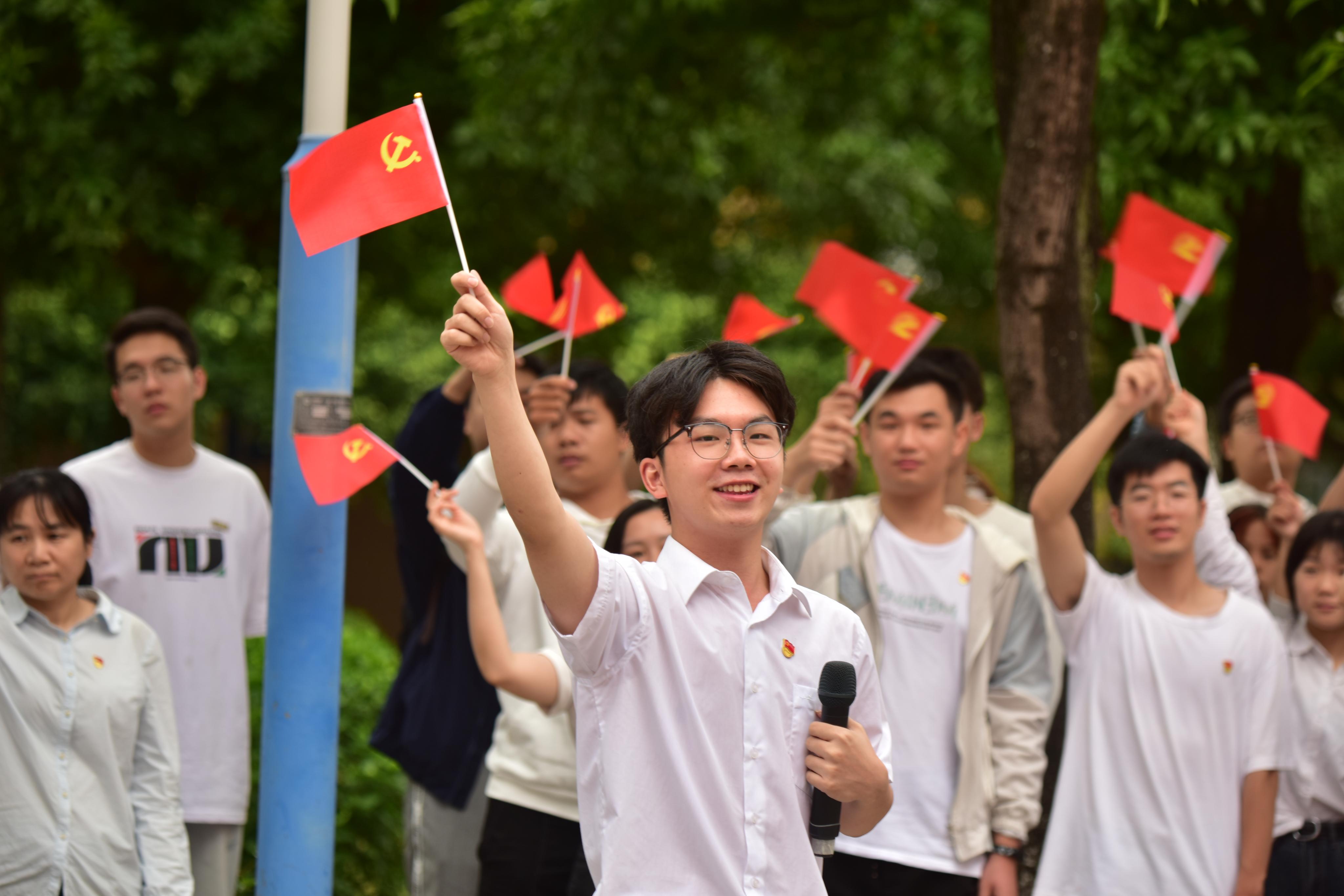 在旗山校区学院5号楼前举办“党旗下的深情告白”主题活动,学院党政班子成员、各党支部书记、辅导员以及师生代表等共300多人参加了活动。