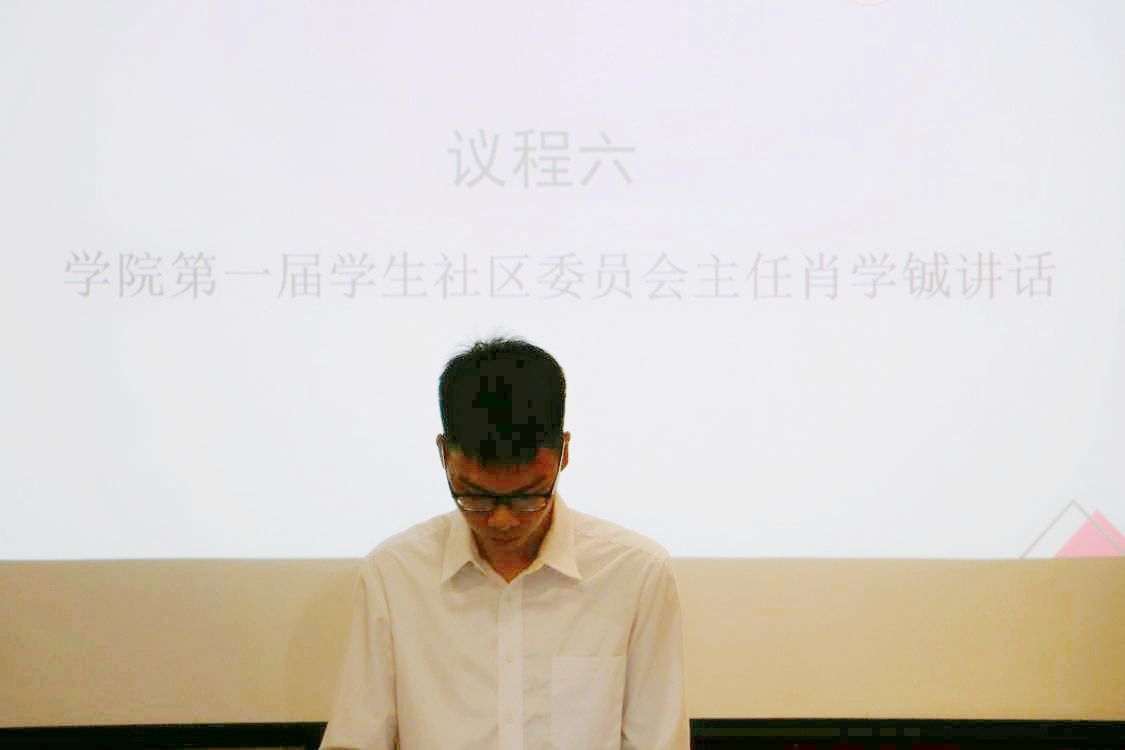 随后,学院第一届学生社区委员会主任肖学铖同学上台讲话,他表明学院学生社区委员会的成立是为进一步推动“三全育人”综合改革试点工作,提出以“服务社区,在你身边”作为学院社委会的宗旨,在未来的工作中,全体社委会成员将继承和发扬杏吧传媒