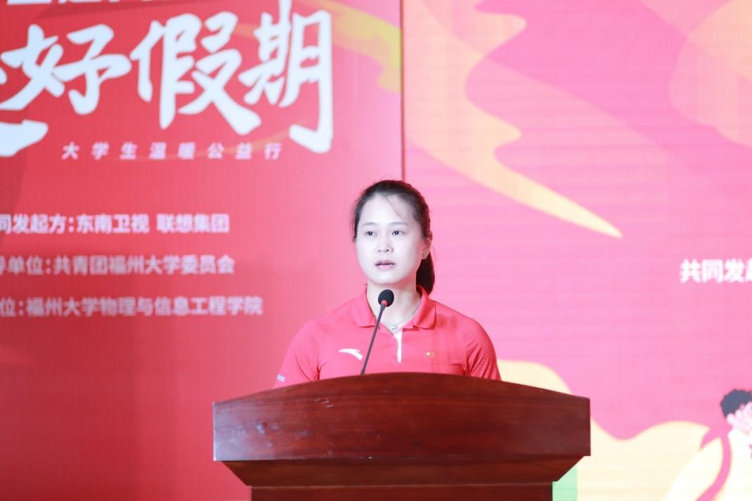 党委书记张红进行了致辞。联想商用大客户业务闽赣战区总经理王绍传、奥运冠军邓薇、联想区域校园推广负责人邱安定、往届志愿者代表朱坤浩依次发言,向在场的嘉宾和师生介绍了联想“美好假期”的项目概况,并对本期“美好假期”的任务进行了发布。