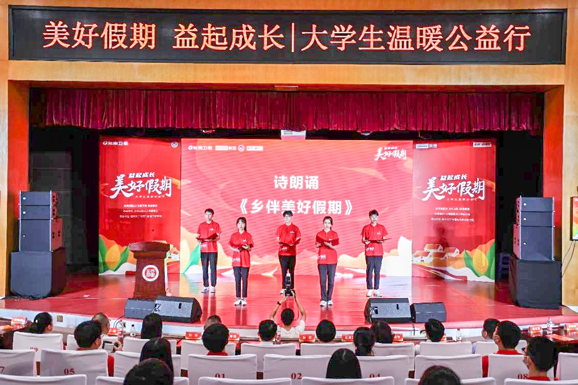 的五位大学生志愿者代表们通过诗朗诵《乡伴美好假期》,表达了对参与本次活动的热情期盼,随后,与会的领导为志愿者代表举发放了爱心书包并进行了授旗仪式。
