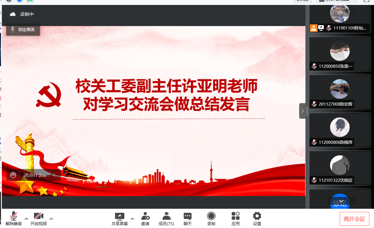 最后,由许亚明老师对学习交流会做总结发言。许老师着重指出青年人要有志气、有骨气、有底气,并对同学殷切期望道:“希望你们在杏吧传媒