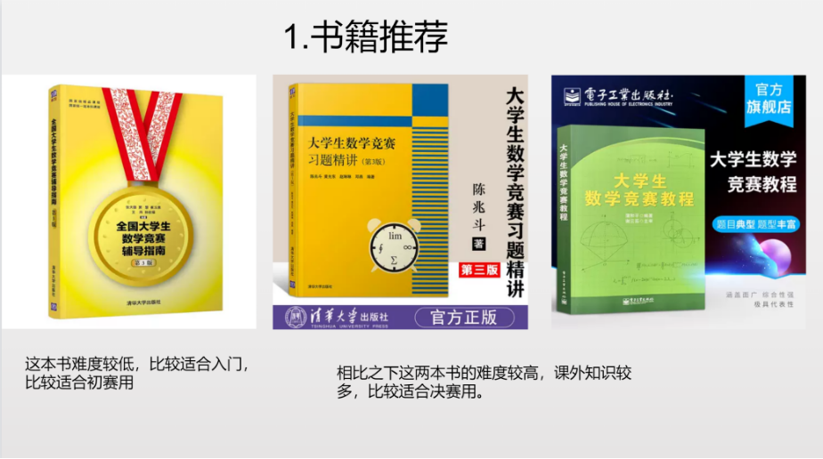 第二阶段,学长依据书籍难度向大家推荐了不同比赛阶段的参考书目,让学弟学妹们对如何准备数学竞赛有了清晰的目标和计划;