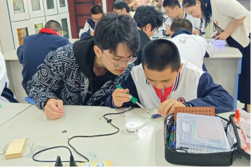 的学生党员们手把手指导闽侯实验中学的同学们进行了“PCB机器人”焊接,帮助中学生们在动手实践中启迪科学思维、感悟科学精神。