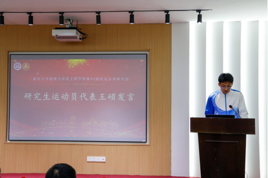 研究生运动员代表王硕同学表达了在本次校运会取得跳高第一名成绩的喜悦,由衷的表达了对学院辛勤栽培的感谢,并从热爱与坚持、纪律与自律、合作与团队精神、勇于挑战自我四个方面分享了自己在本次运动会的心得体会。