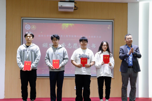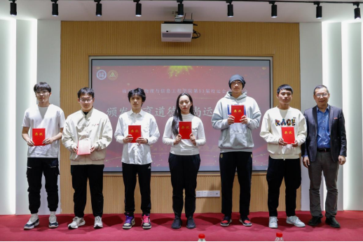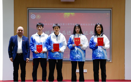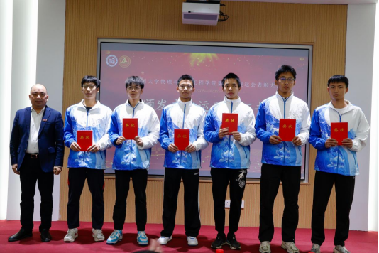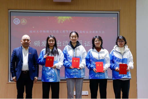 在颁奖仪式环节,学院党委书记魏金明老师、党委副书记郑志刚老师为杰出运动员、标兵运动员、优秀运动员、体育道德风尚运动员、先进工作者、优秀志愿者颁发证书。