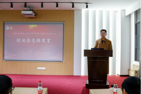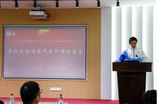 随后,运动员代表进行了发言。本科生运动员代表许堉林同学回顾了个人训练的汗水与艰辛,表达了对学院和老师的感激和对打破5000米校运会记录的喜悦,同时,他呼吁更多同学能重视体育运动,为学院的体育发展贡献力量。