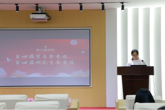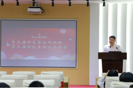 研究生会章程(草案)》,紧接着由学院学生会执行主席林鸿皓同学向大会汇报第三届学生会工作情况,学院研究生会执行主席周俊伟同学为大家汇报第三届研究生会工作情况。他们在报告中系统地回顾了第三届学生会及研究生会工作情况,总结工作经验。