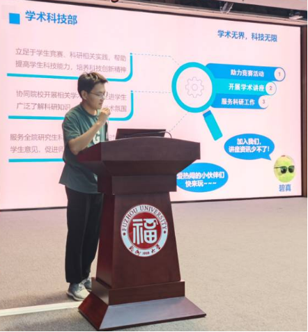 团委研究生会的李欣宇同学上台进行研会纳新宣讲,他介绍了研究生会的组织架构、工作内容以及丰富多彩的活动,鼓励新生们积极参与其中,锻炼自己的能力,丰富研究生生活。