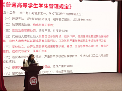 会议最后,针对上述典型案例,吴老师希望每位同学以此为戒,严以律己,牢固树立“以遵纪守法为荣,以违法乱纪为耻”的社会主义荣辱观,珍爱生命,健康生活,清白做事,干净做人,用智慧的双眼,清醒的头脑,理智的行为,努力成为遵纪守法的实践者、宣传者、监督者。