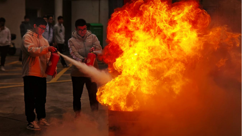 演练结束后,保卫部消防科科长吴登雷老师详细地为同学们讲解了身处火场的正确逃离方法和灭火器械的正确使用方法,并进行实践操作教学,全体参训师生进行灭火演练。