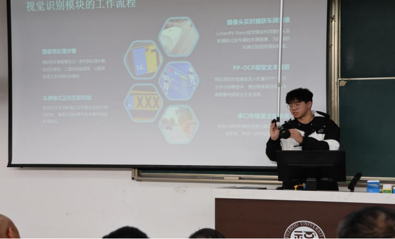 根据大赛流程安排,每个参赛团队有3分钟时间展示作品,展示结束后,评委根据作品内容进行提问与指导,帮助参赛团队完善作品,为两周后的最终测评做准备。比赛中,21支参赛团队依次展示了各具特色的科技作品,分别涉及智能控制、电子设备、监测系统等多个领域,充分展现了学生们扎实的专业知识和敏锐的创新思维。