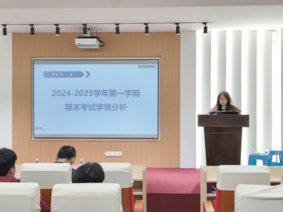 接着,院学生发展中心主任陈诗祺对2024-2025 学年第一学期期末考试学情数据进行深度剖析,通过横向与纵向对比各年级各专业的绩点分布情况、挂科率以及优秀率,指出了各班级存在的问题和不足。