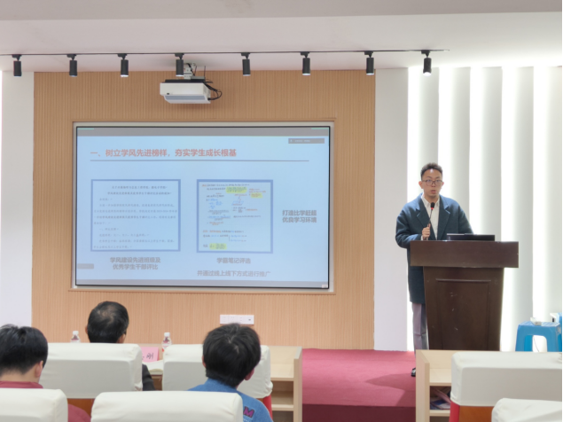 随后,刘涛老师结合各年级的实际情况,从强化基础学风、鼓励竞赛参与、规划主题班会、常抓考风考纪等方面进行了工作安排。同时,刘涛老师还针对不同年级的特点,给出了具体的指导意见,并介绍了本学期学生发展中心推动学院学风建设的系列工作。