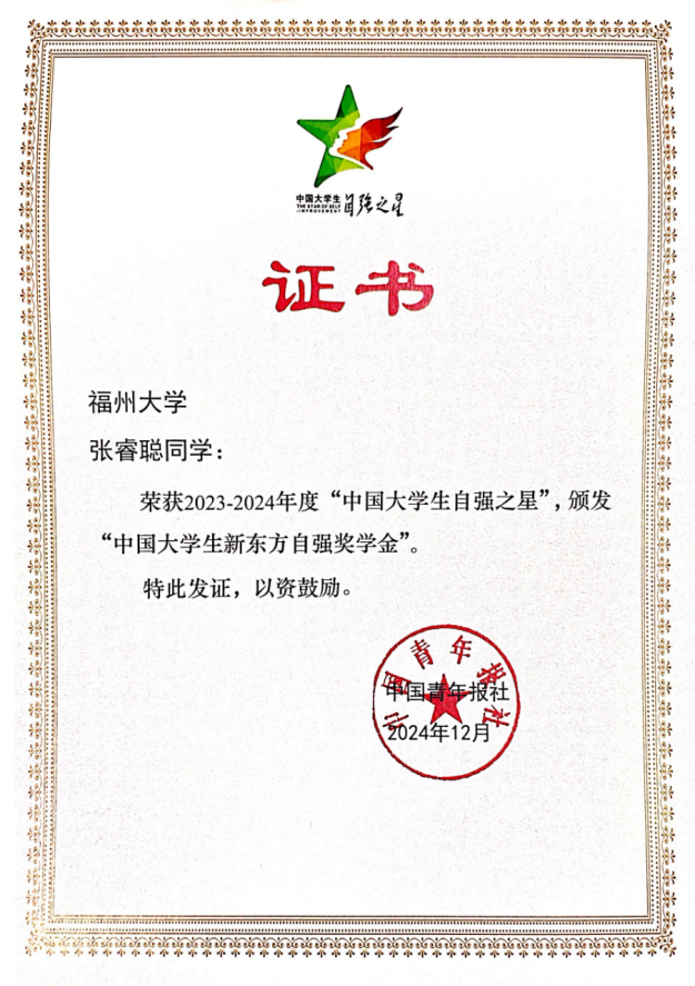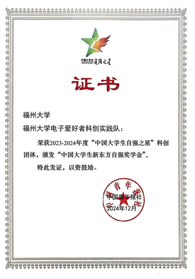 义务维修队暨电子爱好者科创实践队获评“中国大学生自强之星”科创团体荣誉称号,2020级本科生张睿聪获评“中国大学生自强之星”荣誉称号。