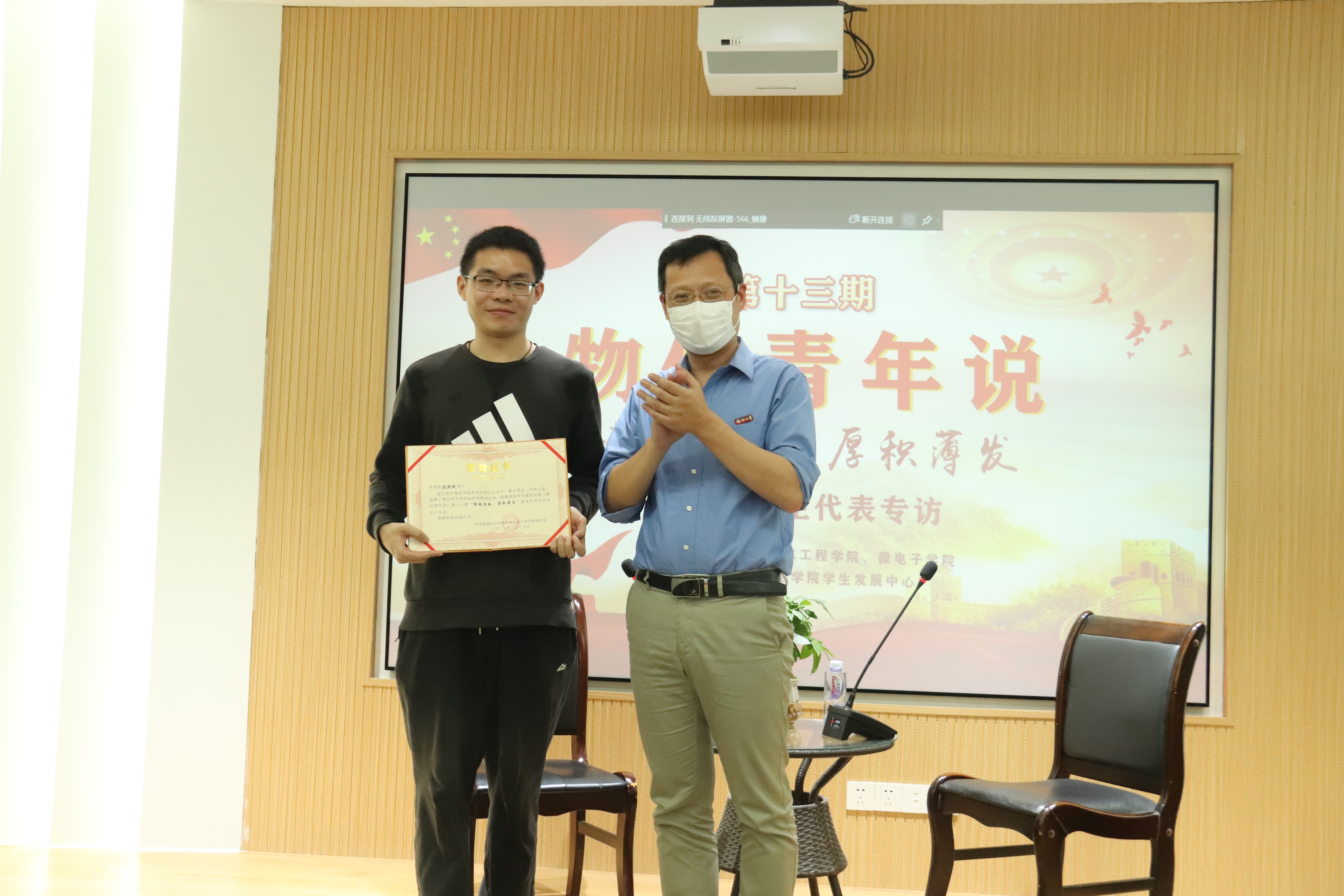 最后,由学院党委郑志刚副书记为陈博士颁发了物信青年荣誉证书,为本期《物信青年说》画上完美的句号。