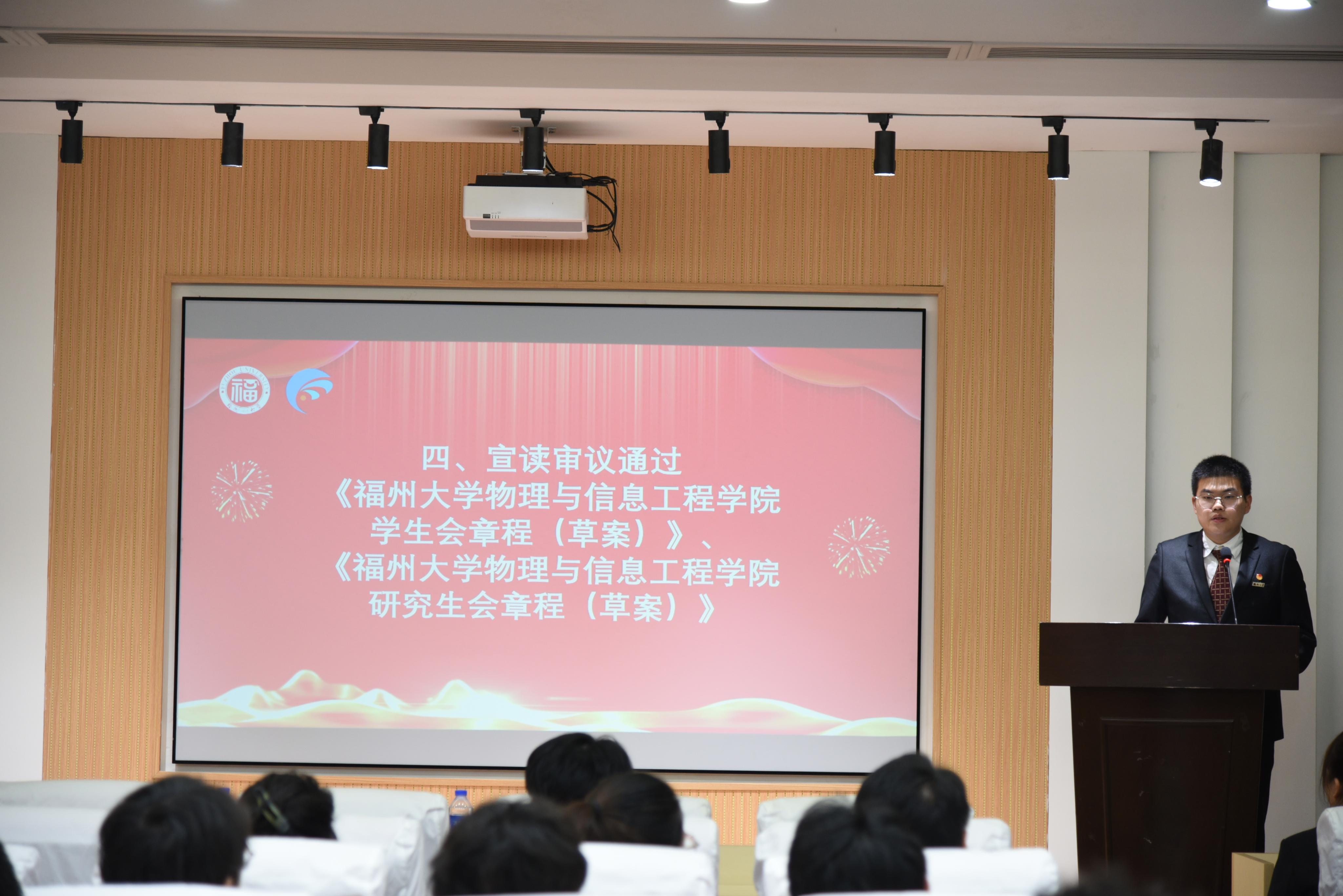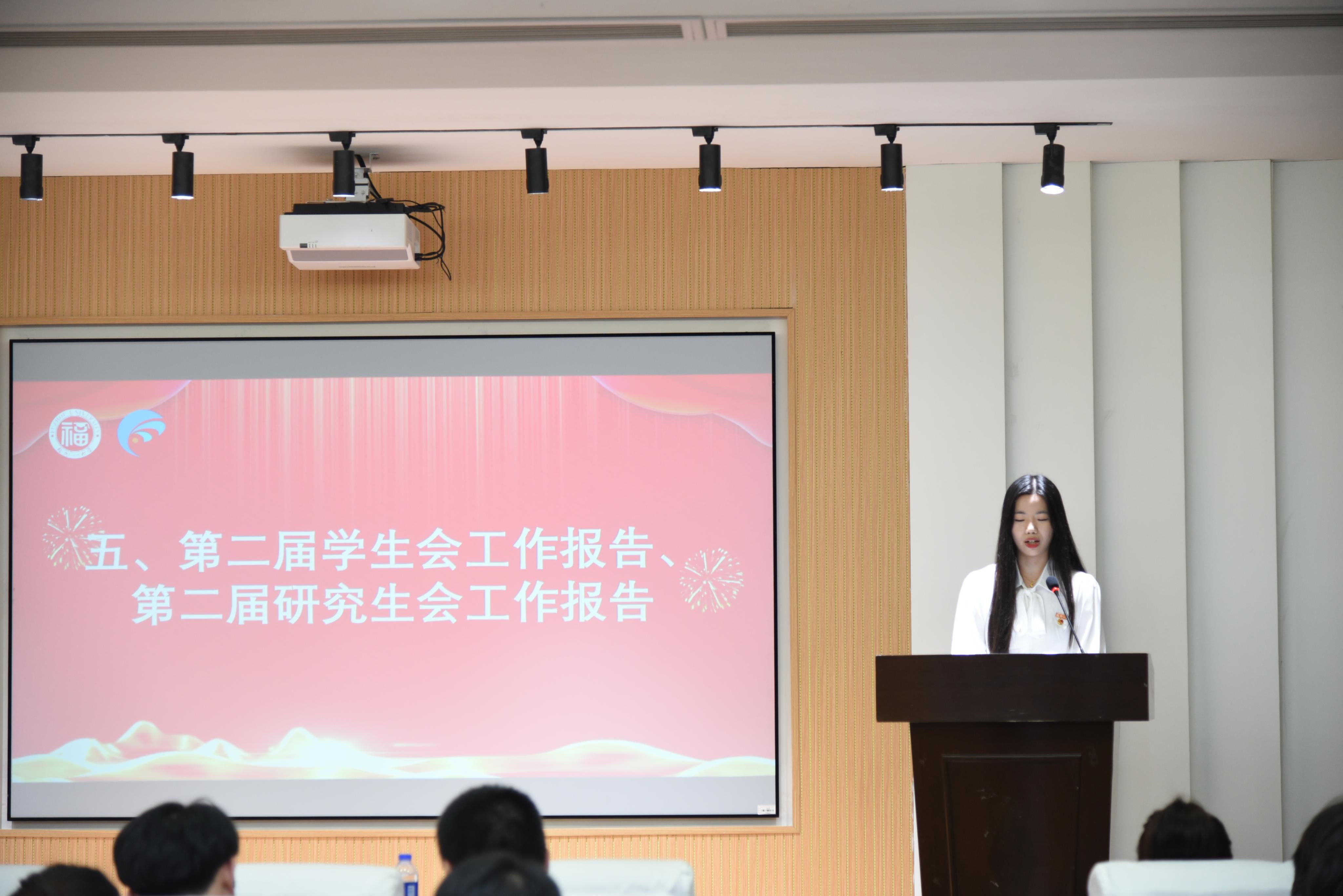 研究生会章程(草案)》。紧接着由学院学生会执行主席钟涛同学向大会汇报第二届学生会工作情况,学院研究生会执行主席黄立萱同学向大会汇报第二届研究生会工作情况。他们在报告中系统地回顾了第二届学生会及研究生会工作情况,总结工作经验。