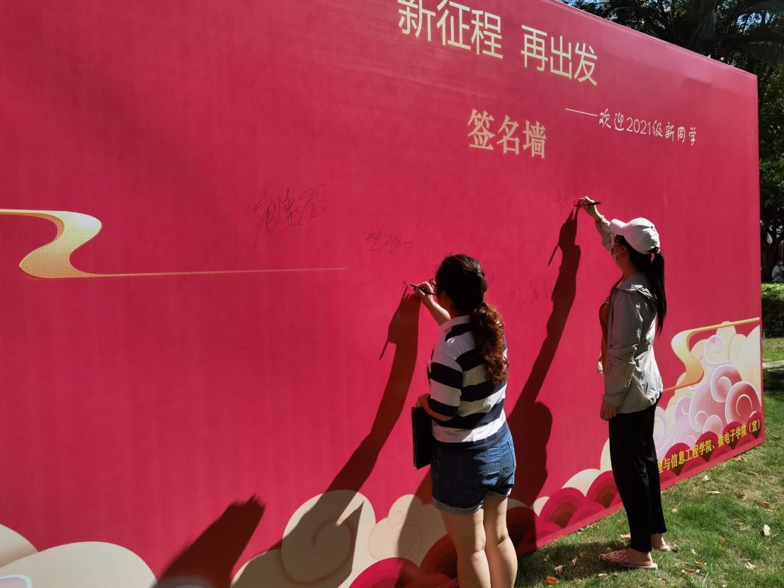 在迎新现场,新生还纷纷在“新征程 再出发”签名墙上书写下了属于自己的一片“天地”,留下了值得他们以后怀念的记忆和瞬间,留下了自己的青春撷影。