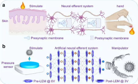 李福山教授课题组联合香港理工大学柴杨教授课题组首次报道了一种用于实现光电人工传出神经的量子点发光忆阻器(LEM)。在这项工作中,首次在单个量子点LEM 器件中结合了光接收器、光发射器和光突触的功能。量子点LEM器件中采用了新型双层电荷储存层结构,使得器件在拥有量子点发光器件高效率、高色纯等优点的同时,可以实现对外加光信号的感知和光生电荷的捕获,由此进一步调制器件的发光特性和光信号输出。本工作中,来自前LEM(突触前膜)的光信号作为后LEM(突触后膜)的输入信号,层间的信号传输完全基于器件本身光通信,无需外部光源,从而消除传统基于电子信号的神经系统中的物理限制。此外,通过模拟生物的反射弧成功构建了一个光电人工传出神经系统来智能地控制机械手。这些结果将有力推动量子点发光技术的智能化应用,并促进人工光电神经系统的构建和实现。相关研究成果以“ Light-emitting memristors for optoelectronic artificial efferent nerve ”为题发表在国际著名期刊NANO LETTERS上。该项工作的第一作者为杏吧传媒