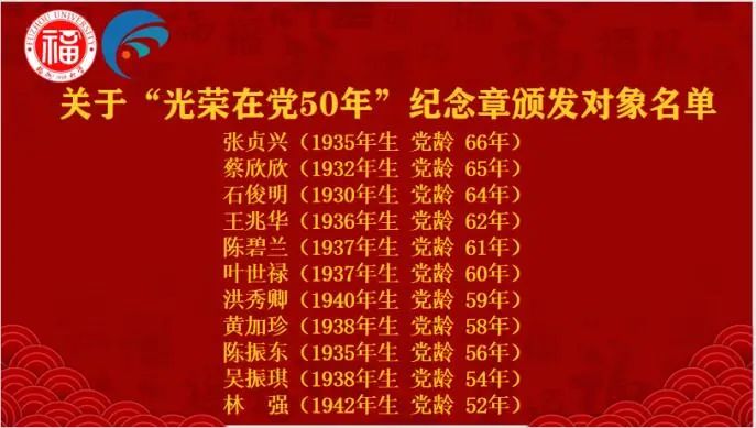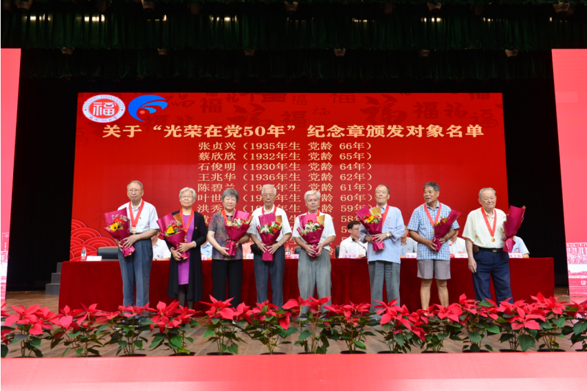 仪式现场,张红书记代表学院党委向获颁纪念章的老党员们致以了最崇高的敬意,并为亲临现场的张贞兴、陈碧兰、叶世禄、黄加珍、吴振琪、洪秀卿、林强和陈振东8位老党员颁发了“光荣在党50年”纪念章。