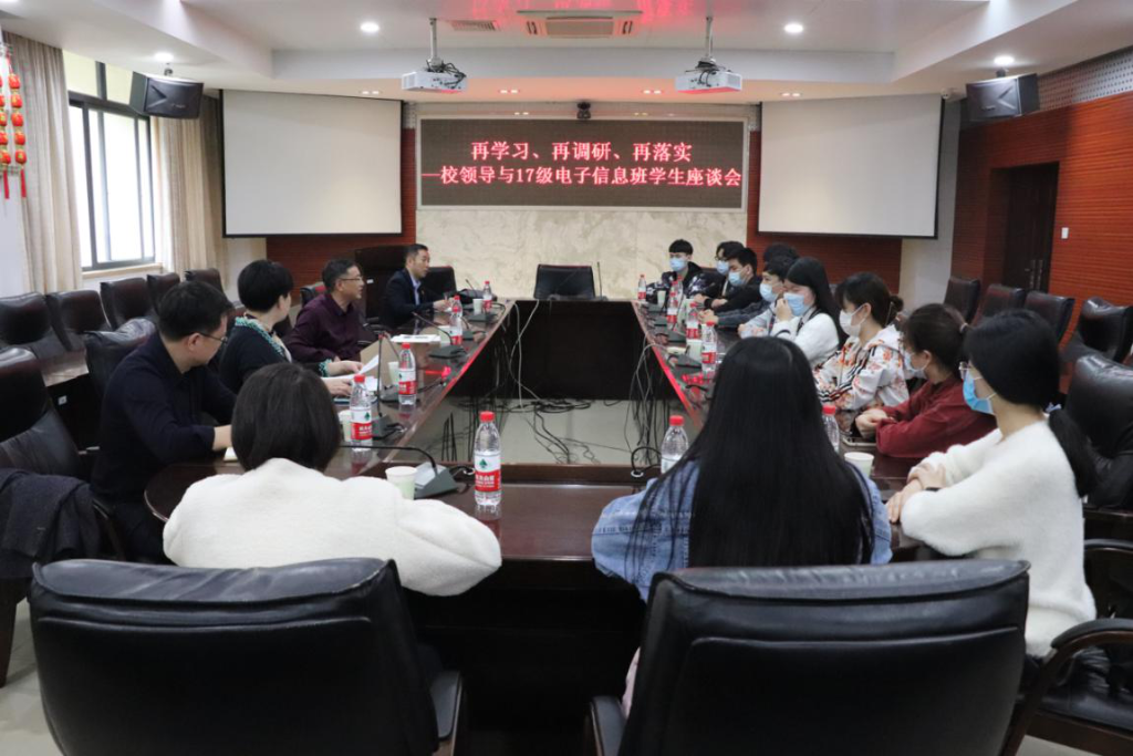 开展“再学习、再调研、再落实”活动,与2017级电子信息2班学生交流座谈。学院党委领导和2017级辅导员列席了会议。